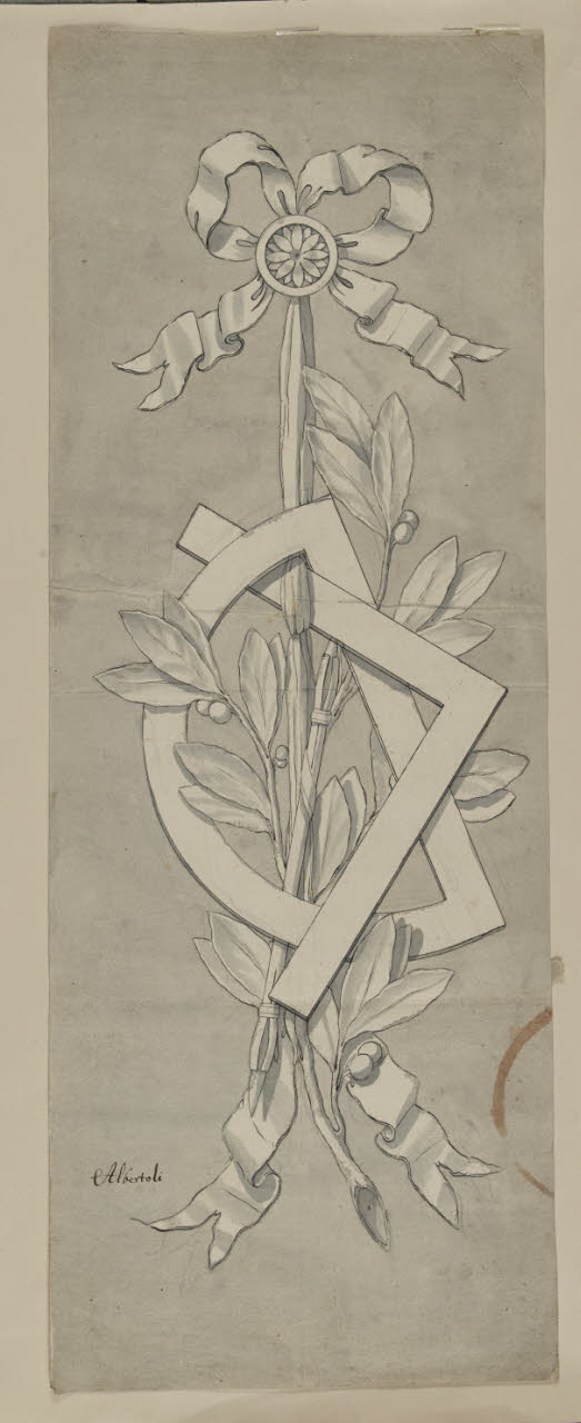 - NOTIZIE STORICO CRITICHE Questo trofeo, composto da un tralcio d'ulivo, un goniometro e una squadra, potrebbe essere inteso come un'allegoria dell'Architettura. Il nome Albertolli nella scritta in basso a sinistra dovrebbe stare a indicare Raffaele Albertolli (1770-1812), figlio di Giocondo. Il disegno, i cinque successivi (C 1 bis, 2, 3, 4, 5) e il foglio B6, appaiono come derivazioni semplificate delle composizioni di Albertolli padre alle tavole XXI-XXIV del volume "Ornamenti diversi" (1782). Si noterà che la qualità di questo disegno e dei numeri successivi non è paragonabile al fregio al numero B 4, che sembra invece attribuibile a Giocondo. Si vedano i fogli B 4, B 6, C 37 e C 39.\n[Beretti - Gonzalez Palacios 2014]