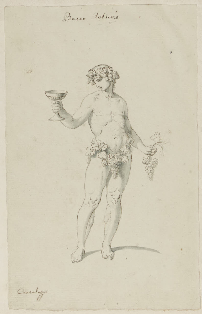 - NOTIZIE STORICO CRITICHE Questo disegno fa parte di un gruppo di otto destinati a due comodini: B 25, B 26, C 28 e C 29 (in orizzontale); B 27, B 28, B 30, B 31 (in verticale). Finora era stato identificato soltanto un comodino apparso ad un'asta di Christie's a Roma il 22-23 aprile 1986. Quando questo catalogo era in bozze abbiamo avuto notizia della comparsa sul mercato antiquario del secondo comodino, che non abbiamo però avuto modo di esaminare. I fogli raffigurano la Terra, l'Inverno, Nettuno, Cerere, Flora, Giunone, Vulcano e Bacco, vale a dire gli Elementi e le Stagioni. Tutti questi disegni, indubbiamente della stessa mano, potrebbero essere opera di quel Carlo Cantaluppi che compare spesso nel fondo, perlopiù con lavori di qualità assai modesta. D'altra parte tutti gli otto fogli recano una scritta (non una firma) col suo nome.\n[Beretti - Gonzalez Palacios 2014]