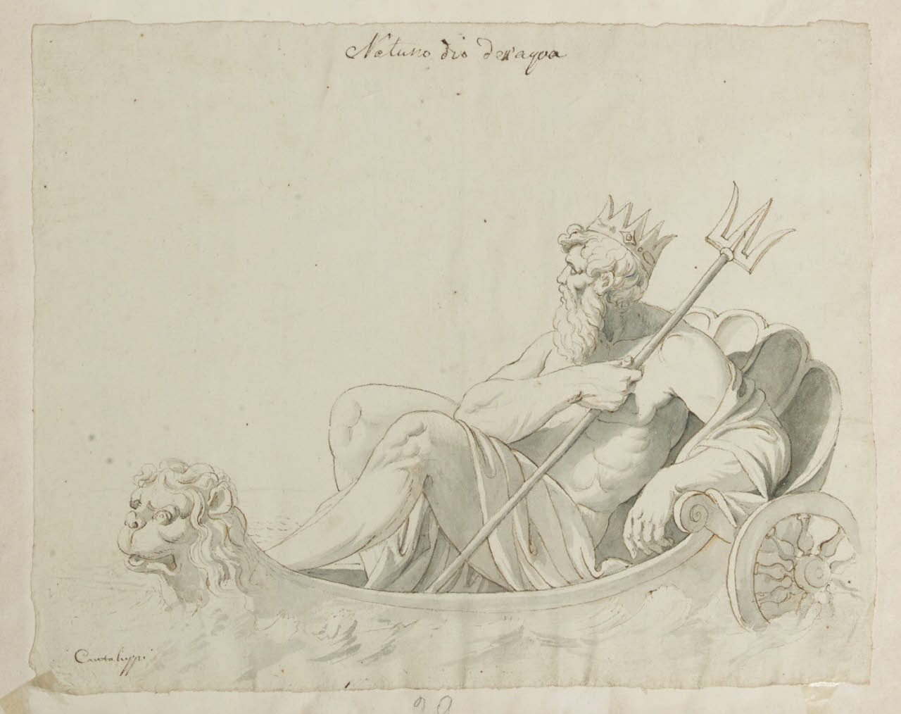 - NOTIZIE STORICO CRITICHE Questo disegno fa parte di un gruppo di otto destinati a due comodini: B 25, B 26, C 28 e C 29 (in orizzontale); B 27, B 28, B 30, B 31 (in verticale). Finora era stato identificato soltanto un comodino apparso ad un'asta di Christie's a Roma il 22-23 aprile 1986. Quando questo catalogo era in bozze abbiamo avuto notizia della comparsa sul mercato antiquario del secondo comodino, che non abbiamo però avuto modo di esaminare. I fogli raffigurano la Terra, l'Inverno, Nettuno, Cerere, Flora, Giunone, Vulcano e Bacco, vale a dire gli Elementi e le Stagioni. Tutti questi disegni, indubbiamente della stessa mano, potrebbero essere opera di quel Carlo Cantaluppi che compare spesso nel fondo, perlopiù con lavori di qualità assai modesta. D'altra parte tutti gli otto fogli recano una scritta (non una firma) col suo nome.\n[Beretti - Gonzalez Palacios 2014]