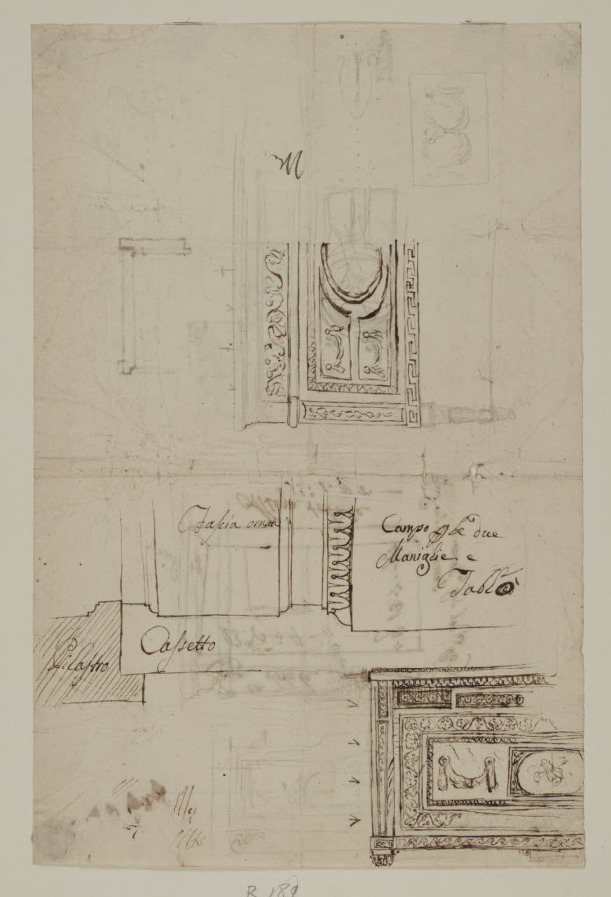 - NOTIZIE STORICO CRITICHE Si tratta di una delle prime idee, forse della prima, per il comò che Giuseppe Maggiolini eseguì nel 1784 per il Marchese Domenico Serra di Genova, il cui nome risulta menzionato sul verso del disegno. Questo mobile, considerato uno dei migliori dell'epoca, servì a diffondere la fama del Maggiolini anche fuori da Milano. Esistono altri disegni nel Fondo per questo stesso arredo (si veda il foglio B 194 verso) che consentono di seguire il compimento dell'idea (B 242). La sicurezza del tratto e delle proporzioni architettoniche consente di chiedersi se Giuseppe o Agostino Gerli (si veda il C 40) fossero coinvolti nella progettazione di questo importante mobile, per il quale venne chiamato anche Giuseppe Levati, per la parte ornamentale. Per i Gerli e il Maggiolini si vedano i fogli: A 23, B 110, B 240, B 242, C 36-40. Sul comò Serra (di cui a quanto sappiamo non esiste fotografia alcuna e che probabilmente andò distrutto nei bombardamenti del Palazzo Spinola-Serra durante la seconda guerra mondiale), si veda il foglio F 3.\n[Beretti - Gonzalez Palacios 2014]
