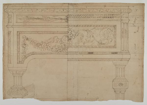 - NOTIZIE STORICO CRITICHE Avanziamo l'ipotesi che questo foglio, di eccellente qualità e a misura di esecuzione, sia collegabile al fare di Giuseppe Levati e Agostino Gerli. Crediamo che possa essere un progetto definitivo per il tavolino donato dall' Arciduca Ferdinando a sua sorella, la Regina di Napoli, di cui parla il Mezzanzanica (1878, p. 54). Per la storia di quest'opera si veda al foglio A 25. La presenza nel disegno qui esaminato di un'aquila potrebbe corroborare la nostra ipotesi, poichè essa è figura araldica della Casa imperiale d'Austria, alla quale apparteneva la Regina Maria Carolina. L'opera destinata a Napoli doveva essere di eccezionale qualità come, del resto, si deduce dal presente foglio e dagli altri disegni del Fondo collegati a quel mobile: A 24, A 25, A 63, B 204, B 287 e C 116.\n[Beretti - Gonzalez Palacios 2014]