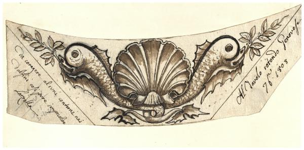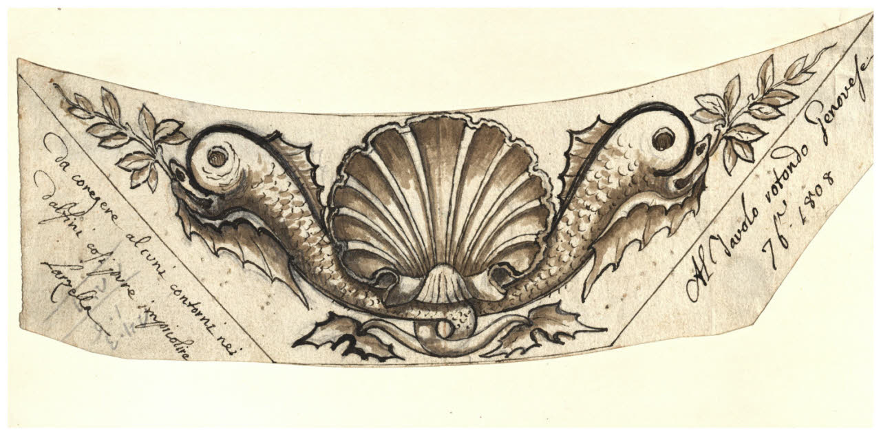 Conchiglia attorniata da due delfini con rami di lauro