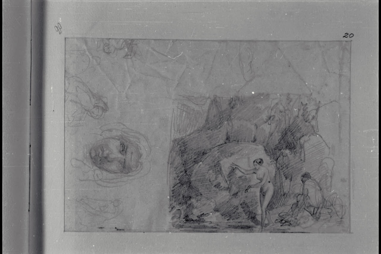 Schizzi vari di teste e figure e scena con bagnanti