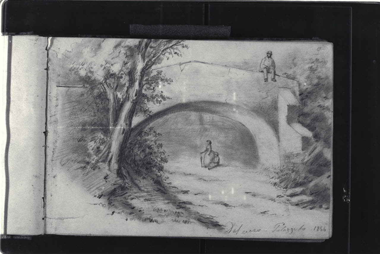 Scorcio dal vero di paesaggio con ponte e macchiette a Palazzolo