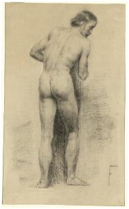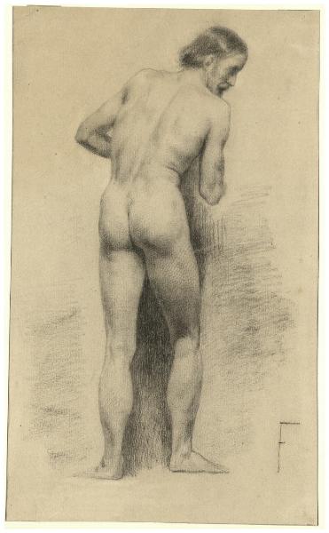 - NOTIZIE STORICO CRITICHE Già appartenuto alla collezione di Antonio Durini, questo disegno di Federico Faruffini, riproducente un nudo maschile visto di tergo, documenta le esercitazioni di copia della figura dal vero condotte dall'artista durante gli anni di studio presso la Civica Scuola di Pittura di Pavia che frequentò dal 1848 al 1855. Probabilmente Faruffini ebbe accesso allo studio del modello dal vero dopo i primi anni dedicati allla copia dei gessi, non prima del 1850 (Finocchi 1989, p. 23).