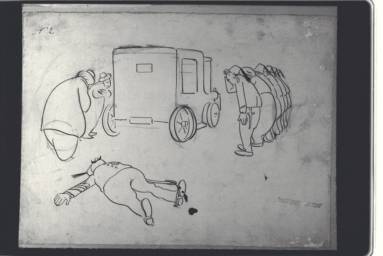 Scena satirica : saluto militare al passaggio di una macchina e in primo piano uomo ferito a terra. Scena satirica : saluto militare al passaggio di una macchina e in primo piano uomo ferito a terra