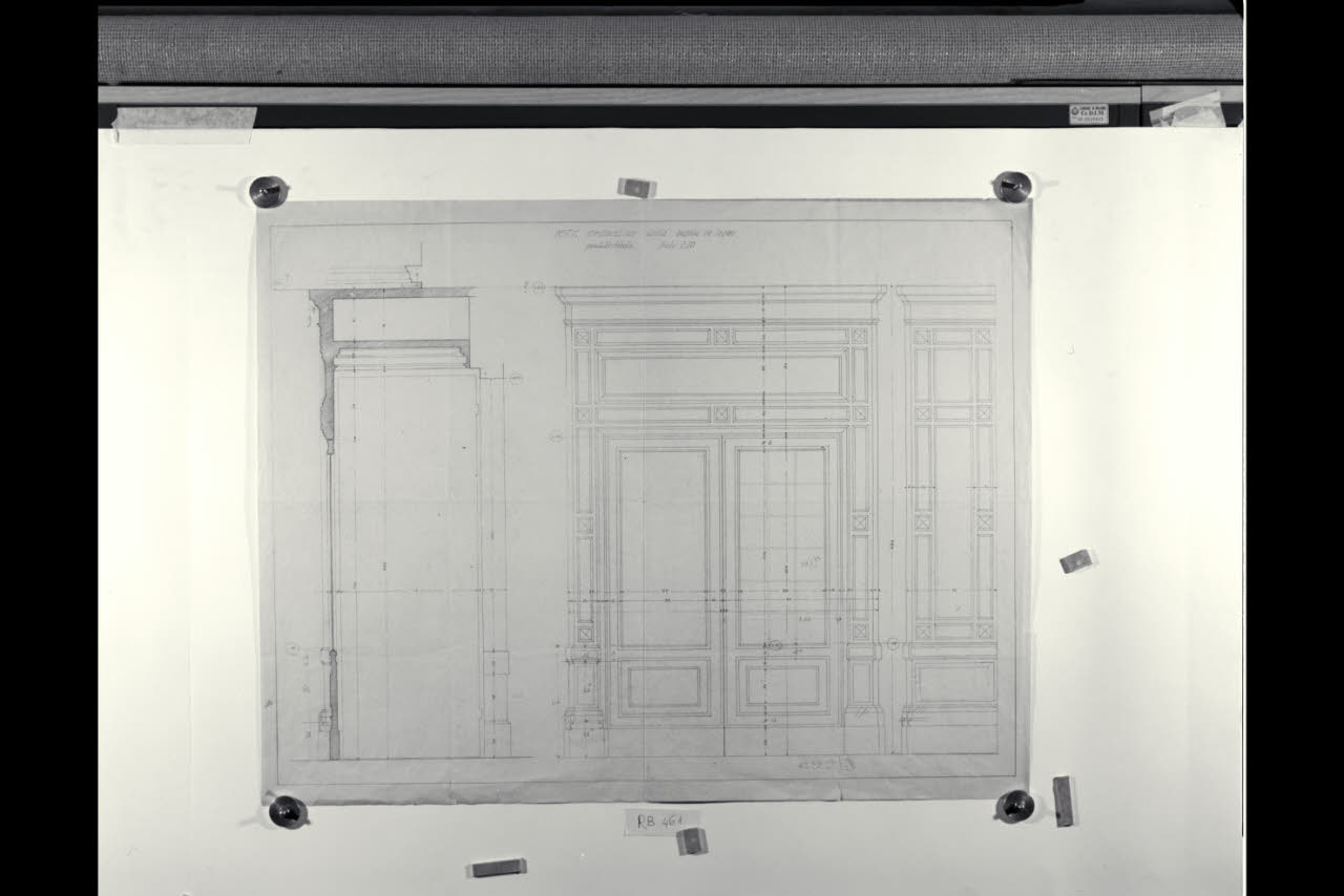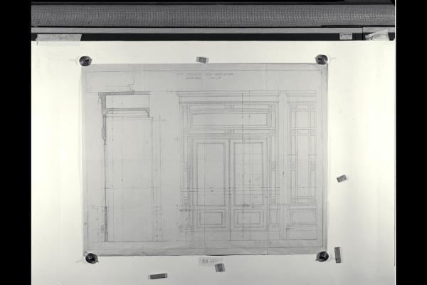 Alzato e sezione dell'ordinazione della bussola in legno per il vestibolo nella Nuova Pinacoteca Vaticana