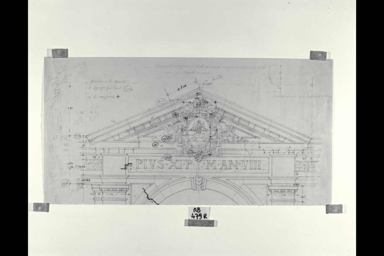 Alzato del timpano con stemma papale di Pio XI nella Nuova Pinacoteca Vaticana