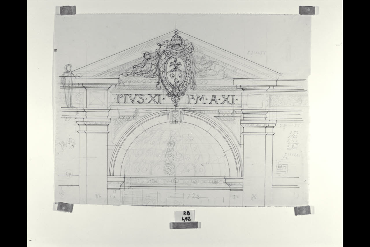 Alzato del timpano con stemma papale di Pio Xi che corona una nicchia nella Nuova Pinacoteca Vaticana