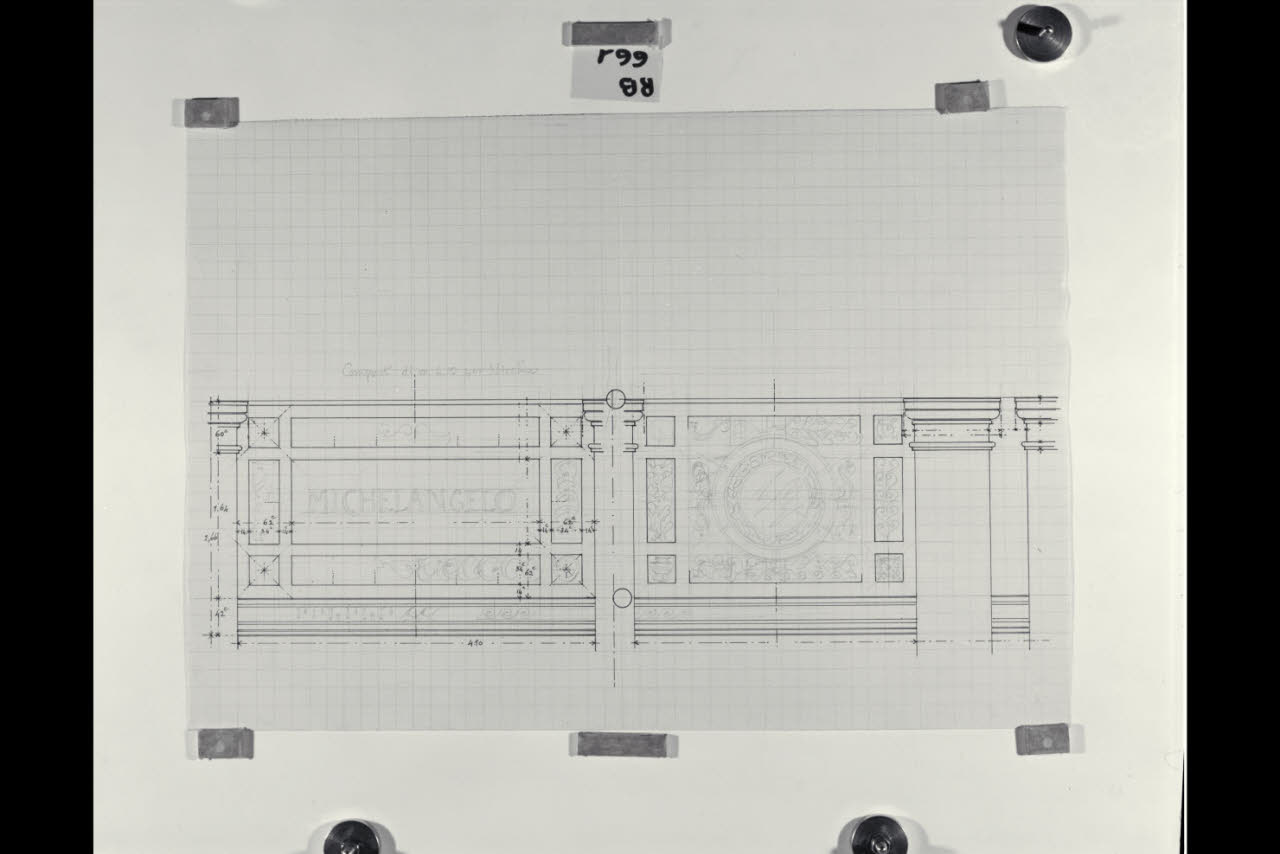 Parte superiore dl comparto con ornamenti e iscrizione dedicatoria a Michelangelo nella Nuova Pinacoteca Vaticana