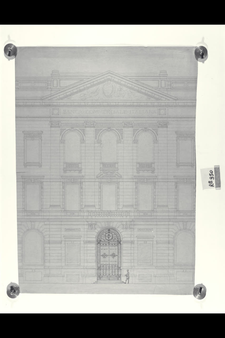 Dettaglio dell'ingresso del prospetto verso piazza Scala della sede centrale di Milano della Banca Commerciale Italiana in piazza della Scala e via Manzoni. Dettaglio dell'ingresso del prospetto verso piazza Scala della sede centrale di Milano della Banca Commerciale Italiana in piazza della Scala e via Manzoni