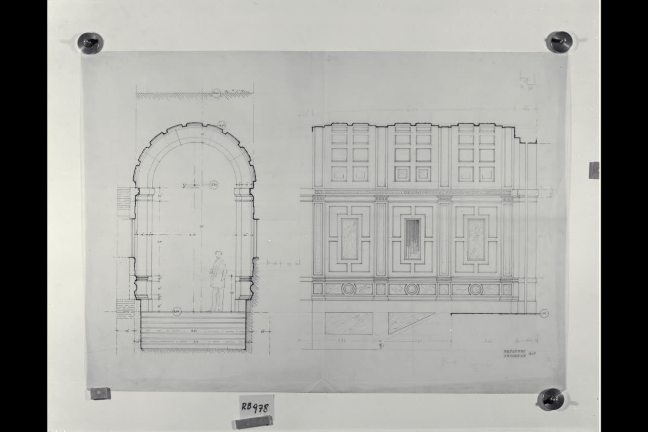 Sezione longitudinale e trasversale di un androne nella sede centrale di Milano della Banca Commerciale Italiana in piazza della Scala e via Santa Margherita. Sezione longitudinale e trasversale di un androne nella sede centrale di Milano della Banca Commerciale Italiana in piazza della Scala e via Santa Margherita