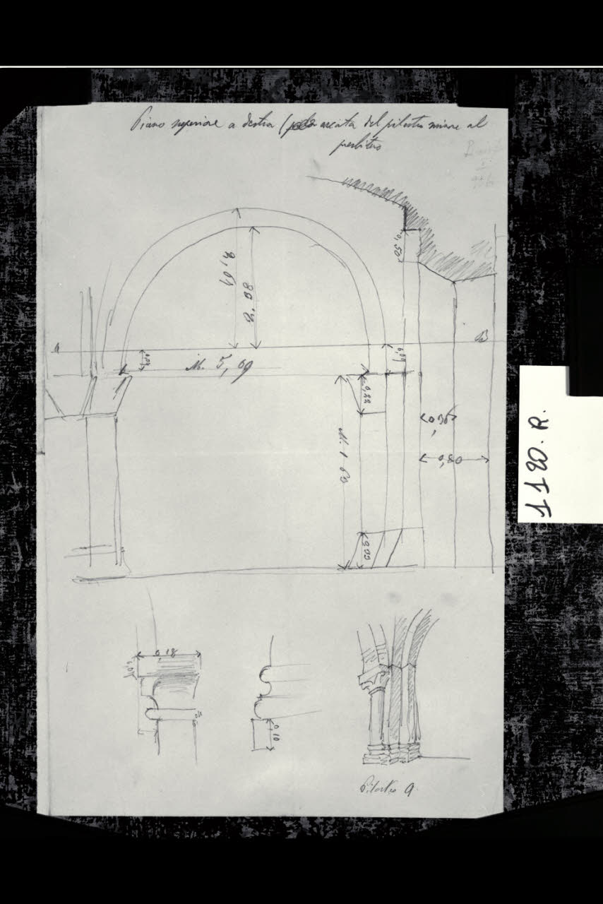 Schizzo del pilastro 9 e rilievo di dettaglio della base della colonna e del capitello nella Basilica di Sant'Ambrogio a Milano