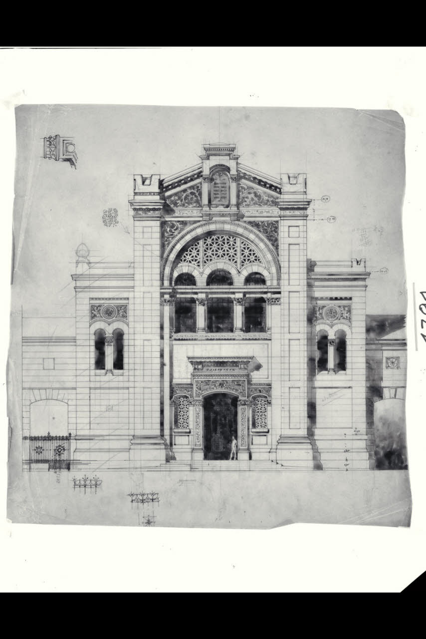 Tempio Israelitico di via della Guastalla. Prospetto sulla via Guastalla. Tavola di studio. Milano, Tempio Israelitico, via Guastalla. Prospetto sulla via Guastalla. Tavola di studio