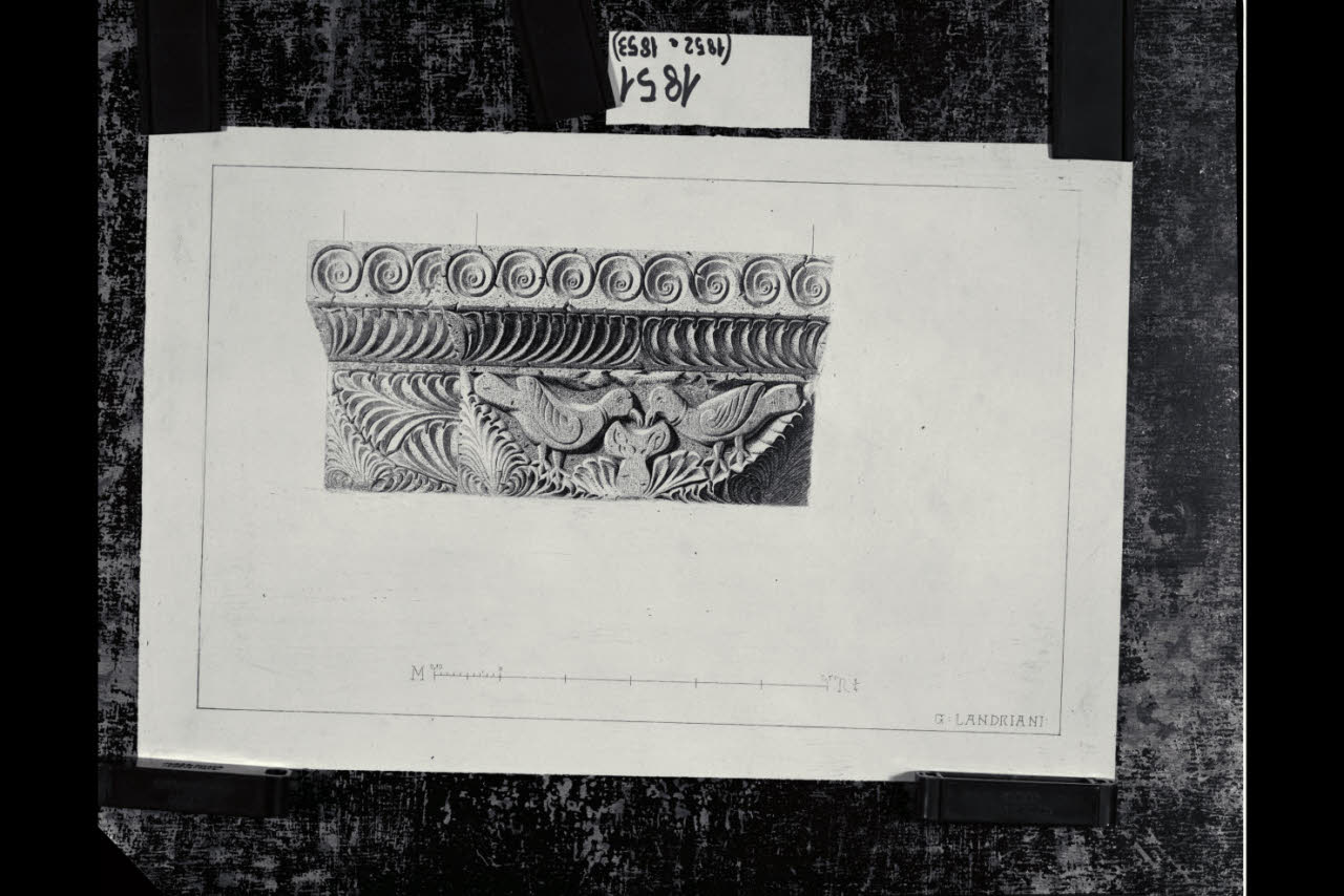 Chiesa di Santa Maria in Aurona a Milano, rilievo dell'apparato scultoreo: capitello di un pilastro con fregio fitomorfo e uccelli