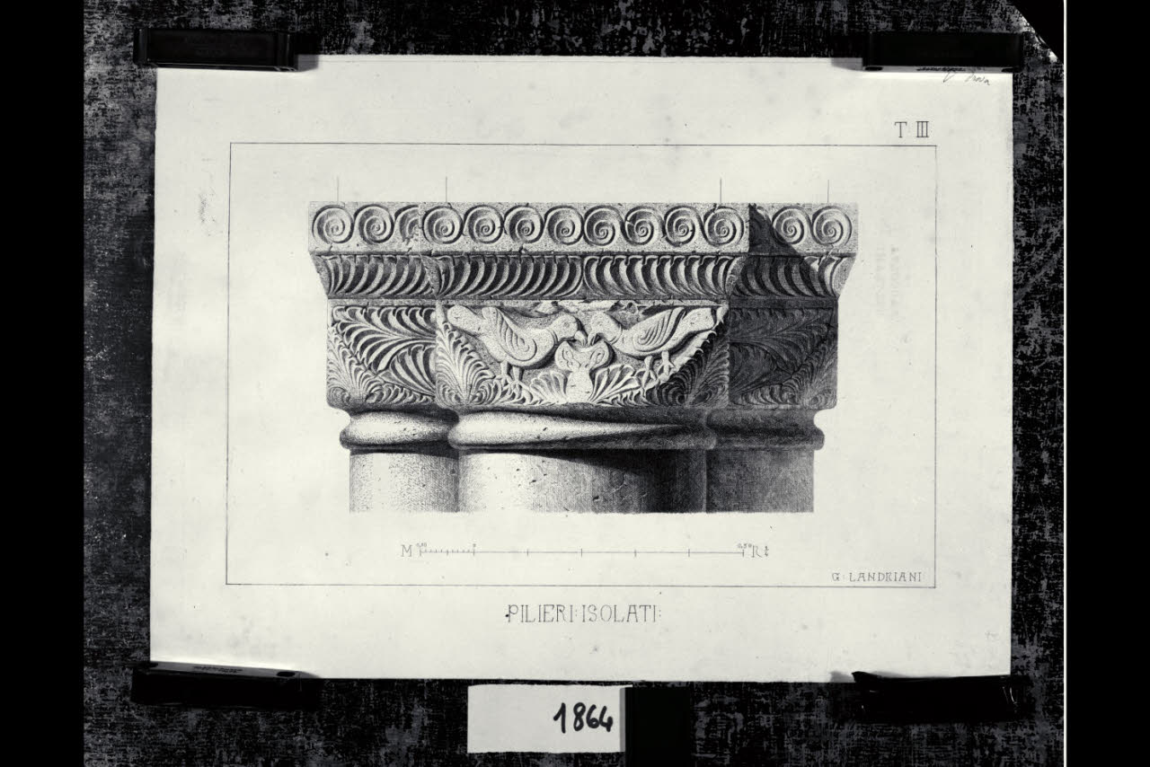 Chiesa di Santa Maria in Aurona a Milano, rilievo dell'apparato scultoreo: capitello di un pilastro con fregio fitomorfo e uccelli