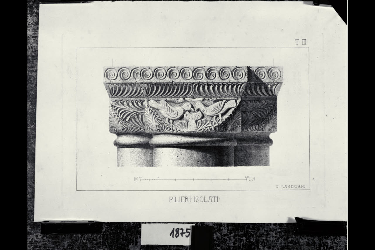Chiesa di Santa Maria in Aurona a Milano, rilievo dell'apparato scultoreo: capitello di un pilastro con fregio fitomorfo e uccelli