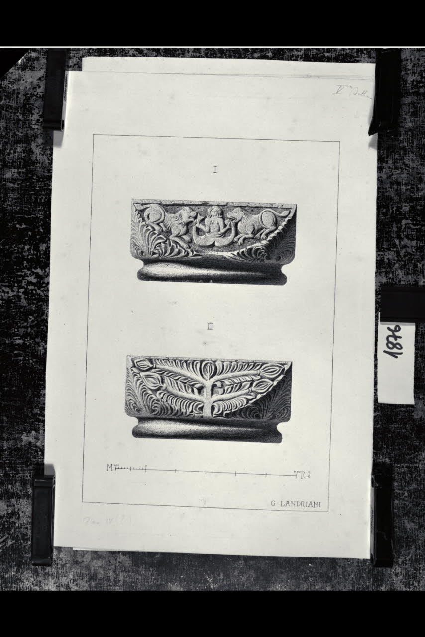 Chiesa di Santa Maria in Aurona a Milano, rilievo dell'apparato scultoreo: capitello figurato con leoni e sirena bicaudata e capitello con decorazione fitomorfa