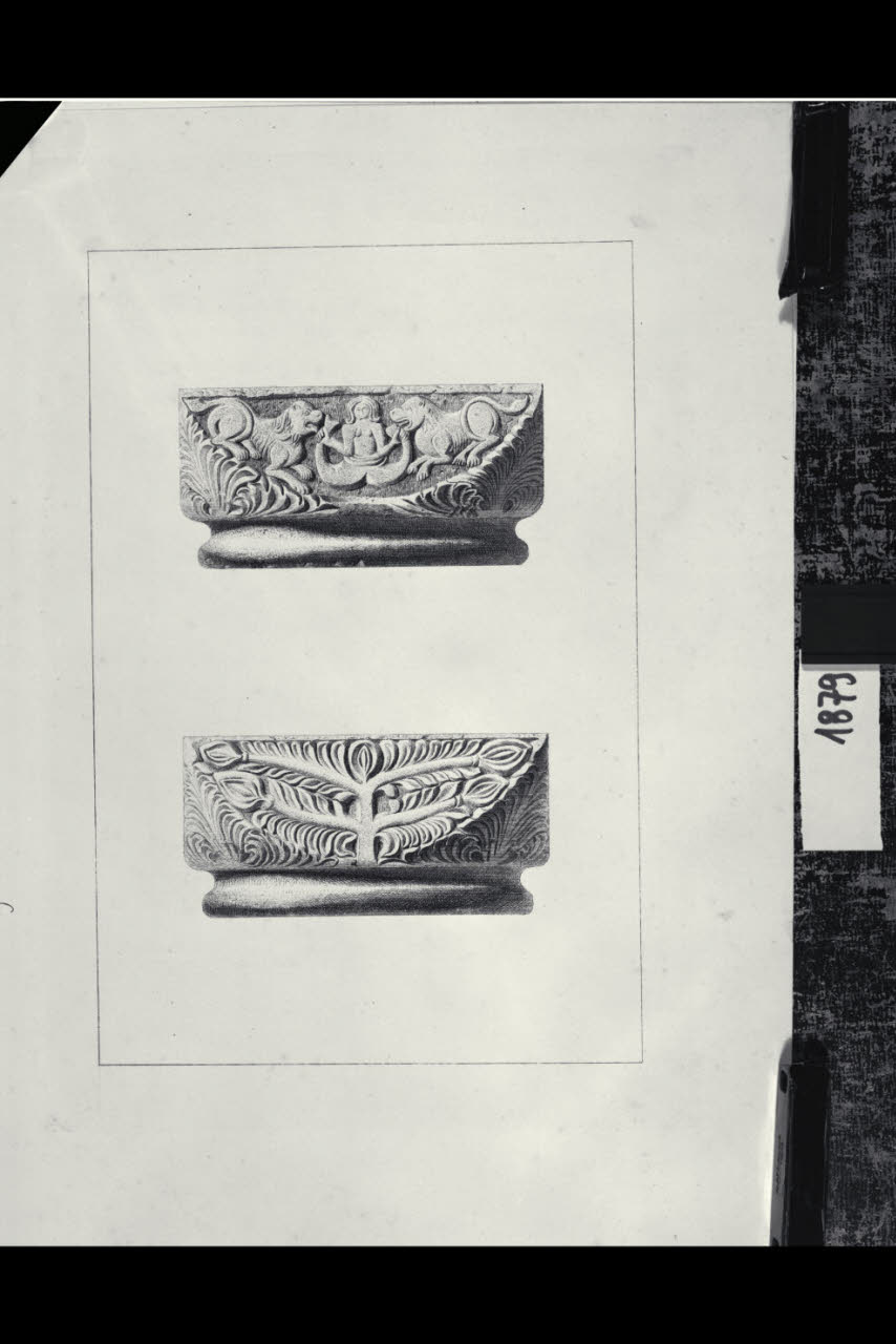 Chiesa di Santa Maria in Aurona a Milano, rilievo dell'apparato scultoreo: capitello figurato con leoni e sirena bicaudata e capitello con decorazione fitomorfa