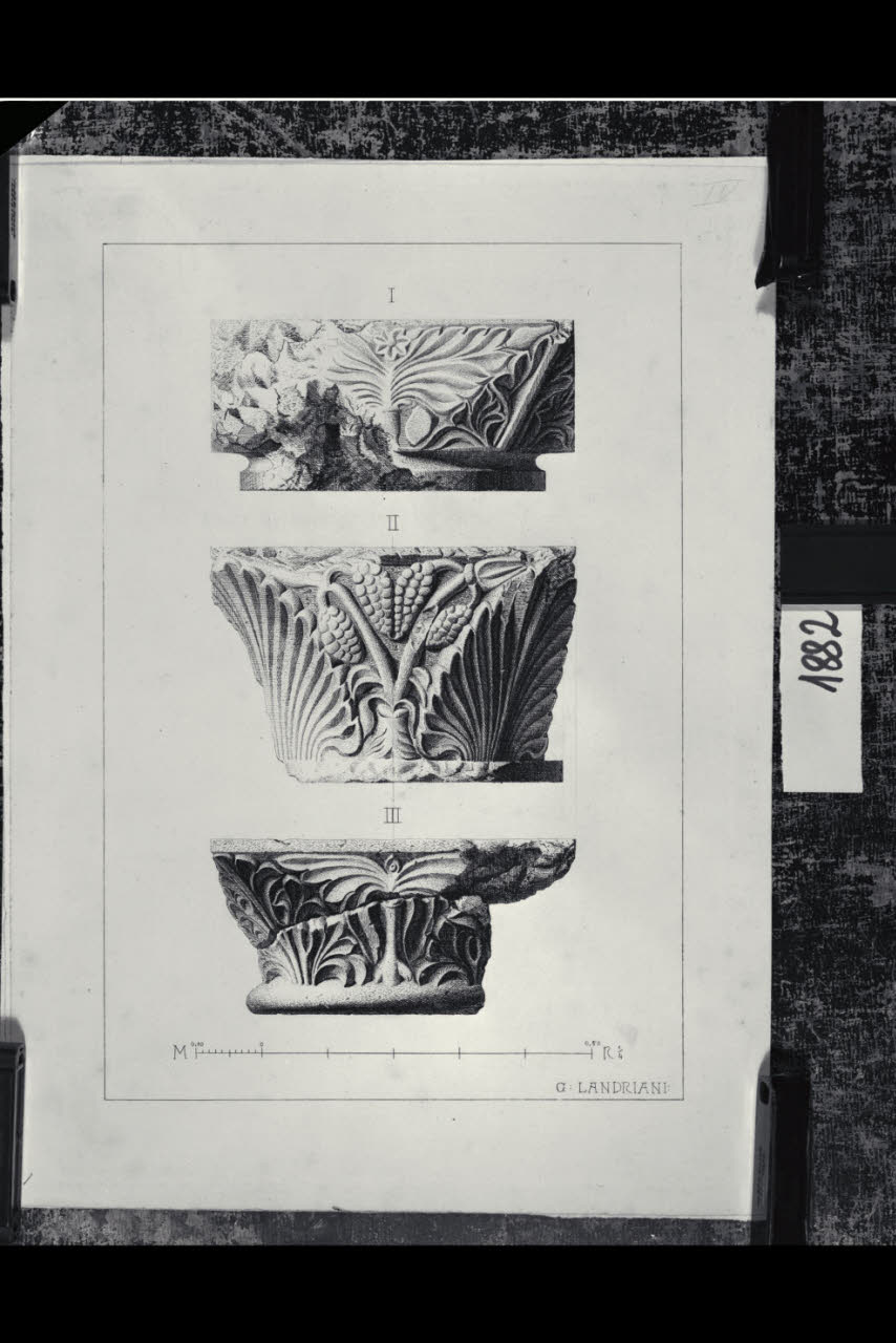 Chiesa di Santa Maria in Aurona a Milano, rilievo dell'apparato scultoreo: tre facce di capitello con decorazione fitomorfa