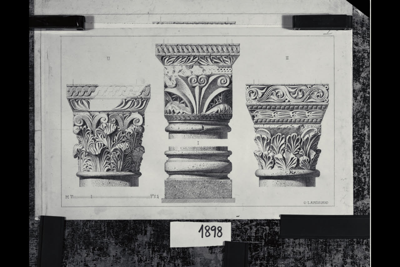 Chiesa di Santa Maria in Aurona a Milano, rilievo dell'apparato scultoreo: tre capitelli e basamento di una colonna