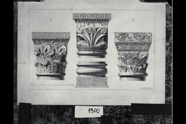 Chiesa di Santa Maria in Aurona a Milano, rilievo dell'apparato scultoreo: tre capitelli e basamento di una colonna