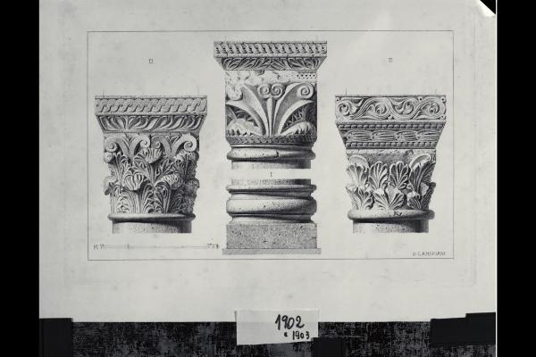 Chiesa di Santa Maria in Aurona a Milano, rilievo dell'apparato scultoreo: tre capitelli e basamento di una colonna