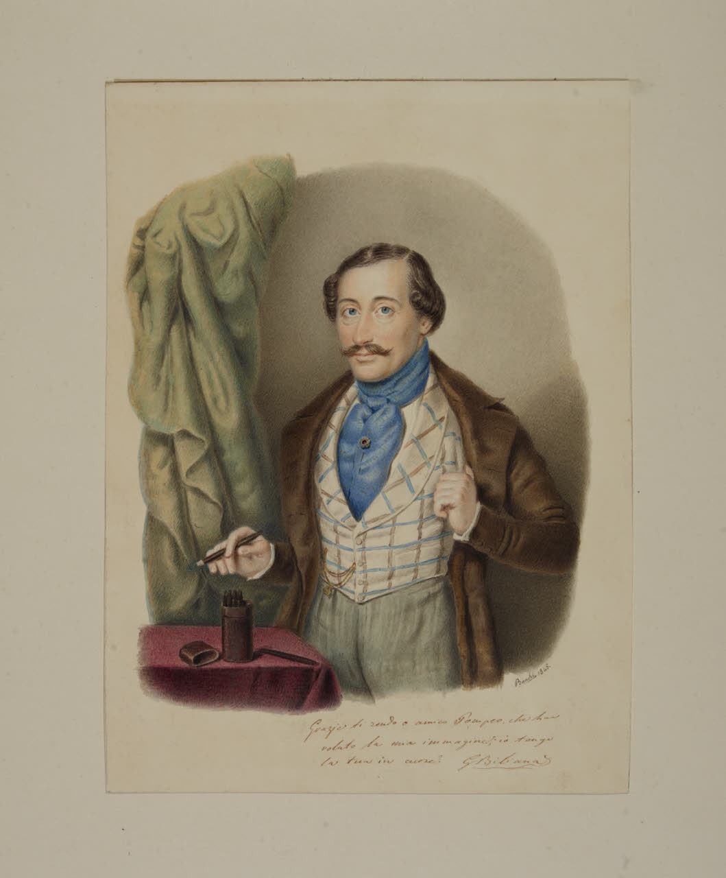 - NOTIZIE STORICO CRITICHE L'acquerello fa parte di una serie di ritratti raffiguranti alcuni amici dello scultore Pompeo Marchesi, realizzati da Giorgio Banchi verso la metà degli Quaranta dell'Ottocento e giunti nelle collezioni civiche milanesi grazie al legato Marchesi-Fogliani del 1862 (invv. Aggiunte 49-55). Il foglio ritrae G. Biliana, che sotto il proprio ritratto vergò una dedica all'amico scultore (cfr. scheda di B. Falconi, in Trasparenze. L'acquarello tra Romanticismo e Belle Epoque 2011, p. 54 cat. 8).