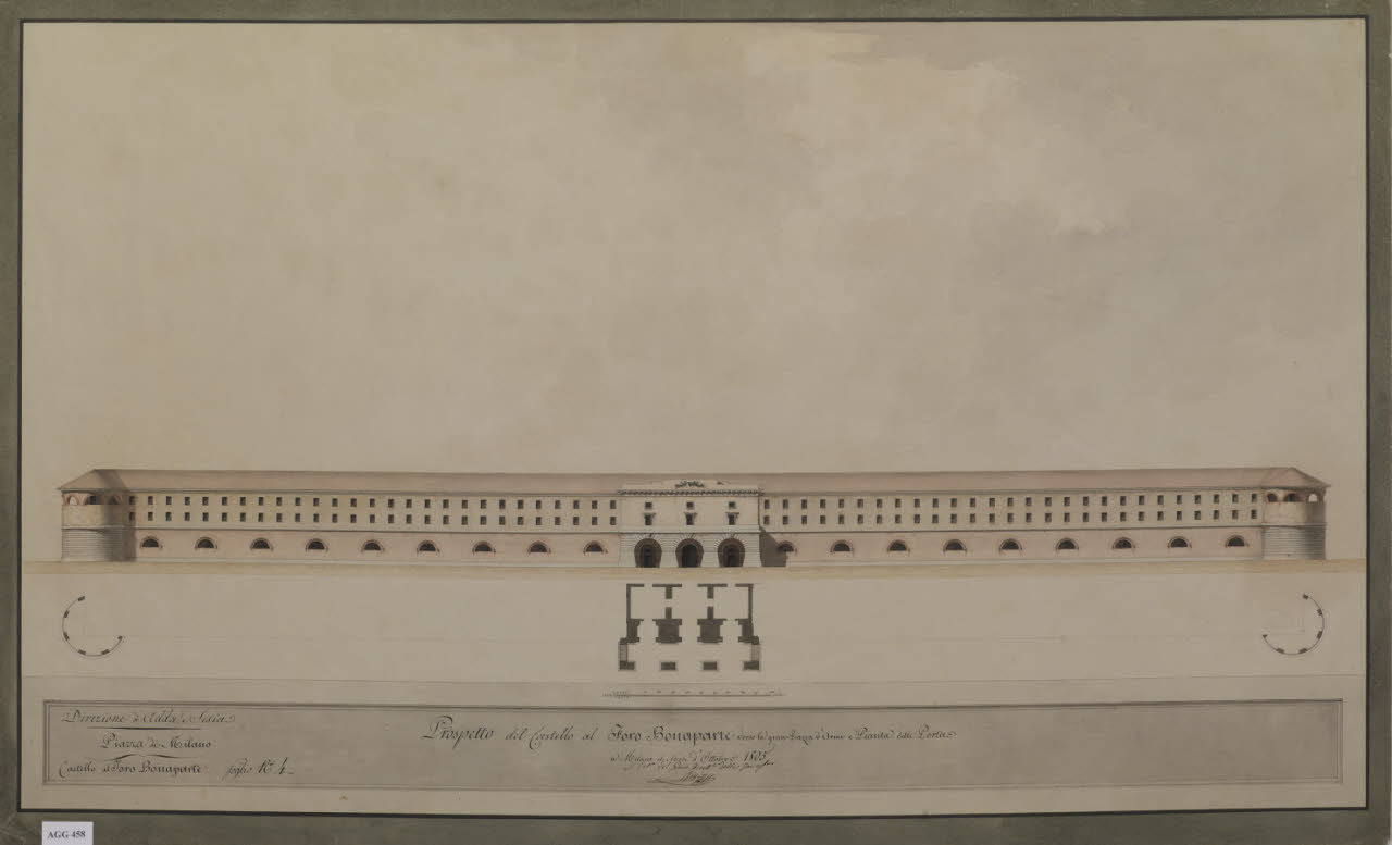 - NOTIZIE STORICO CRITICHE Il progetto del Foro Bonaparte firmato da Giovanni Antolini fu modificato negli anni successivi. Luigi Canonica ridisegnò i fronti del Castello verso la città e la Piazza d'Armi in veste neoclassica, sulla falsariga del progetto antoliniano. Secondo Soldini (1981, 1982), il disegno è opera di Canonica e di Gerolamo Rossi, e mostrerebbe rinvii alla cultura architettonica rivoluzionaria di Ledoux e Boullée.