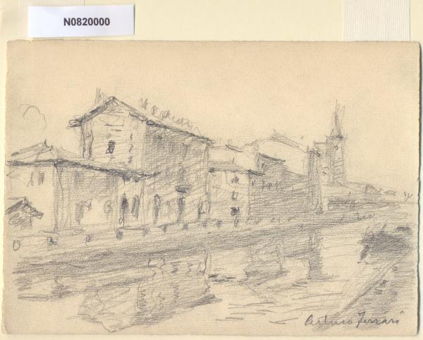 - NOTIZIE STORICO CRITICHE L'artista ha definito il disegno "Sulla Ripa" nella pagina manoscritta che accompagna il primo dei diciotto fascicoli della raccolta denominata "Vecchia Milano". Dai riscontri in loco si ipotizza che l'attuale ubicazione degli edifici scorciati dal Ferrari corrisponda al primo tratto del Naviglio Grande e che il campanile visibile in lontananza sia quello della basilica di Sant'Eustorgio. La medesima inquadratura è riscontrabile nel disegno contrassegnato dal numero di inventario 917.\nOriginariamente le "Ripe" traevano nome dalle località verso cui si convogliavano le loro acque. In particolare la Ripa di Porta Ticinese, si dirigeva verso Pavia, l'antica "Ticinum"; costeggiava il Naviglio Grande, fungendo da passaggio per i cittadini, e si contrapponeva all'opposta riva detta "Alzaia", su cui transitavano i cavalli trainanti i barconi. Il Naviglio Grande, il più esteso canale milanese, era chiamato "Tesinello" poiché riceveva le acque del Ticino nei pressi di Tornavento, e, dopo un percorso di cinquanta chilometri, confluiva in città nella Darsena di Porta Ticinese. Fu scavato alle origini, negli anni tra il 1179 e il 1209, come canale d'irrigazione e in funzione di difesa della città dalle truppe del Barbarossa. Nel 1267 fu chiamato Grande quando la sua sezione fu allargata per renderlo navigabile, assumendo la funzione di importante via commerciale. Tutto il marmo usato per la costruzione del Duomo, dalle cave dell'Ossola, scendendo lungo il fiume Toce, il Lago Maggiore, il Ticino ed il Naviglio Grande, arrivava in città fino al Laghetto di Santo Stefano, vicinissimo al cantiere. La rete fluviale venne completata in seguito con lo scavo di altri canali navigabili, come l'attuale Naviglio Pavese, che collegava Milano con Pavia e che fu definitivamente inaugurato solo nel 1819. \nI Navigli costituivano la fossa interna che assurgeva al compito di arteria urbana per il traffico natante e cingeva la parte più cospicua della città. Attualmente il termine "Navigli", a Milano, identifica i due tratti scoperti del Naviglio Grande (fra le odierne Ripa di Porta Ticinese e l'Alzaia Naviglio Grande, in direzione di via Lodovico il Moro per Buccinasco e Corsico) e del Naviglio Pavese (fra via Ascanio Sforza e l'Alzaia Naviglio Pavese lungo via Chiesa Rossa per raggiungere Rozzano e collegarsi alla Strada dei Giovi) che si insinuano in città fino all'altezza di piazza XXIV Maggio e in senso più generale l'area compresa fra i due Navigli.\nLa vedova di Ferrari, proponendo i disegni all'attenzione del Comune di Milano, riconduceva la loro realizzazione agli ultimi anni di vita del marito. Una delle opere reca la data 1926; inoltre presso il Museo di Milano si conserva un'altra serie di 16 analoghe vedute a matita di Ferrari, datate dal 1924 al 1931. Pertanto si ritiene che la serie del Civico Gabinetto dei Disegni sia stata eseguita nell'arco cronologico dal 1924 al 1932. \nIn quell'epoca Milano stava conoscendo notevoli trasformazioni urbanistiche e il pittore, per contrastare la perdita di memoria provocata dalle demolizioni, decise di fissare nei suoi disegni gli angoli e gli scorci destinati a un radicale cambiamento.