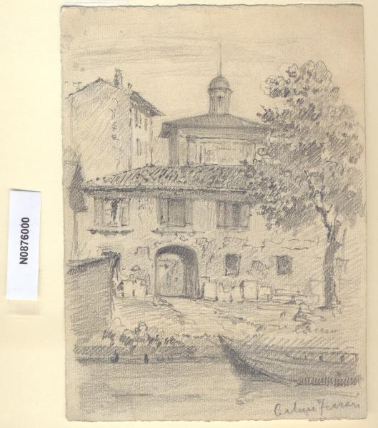- NOTIZIE STORICO CRITICHE L'artista ha definito il disegno "A P. Romana" nella pagina manoscritta che accompagna il sesto dei diciotto fascicoli della raccolta denominata "Vecchia Milano". Dai riscontri in loco si ipotizza che l'attuale ubicazione degli edifici scorciati dal Ferrari corrisponda all'attuale via Francesco Sforza, lungo la quale scorreva la fossa interna, e che l'edificio squadrato coronato da un lanternino, visibile in secondo piano, sia il Mausoleo Trivulzio, anteposto alla basilica di San Nazaro Maggiore.\nSin dall'epoca romana la porta e la via per Piacenza avevano il nome di Porta Romana, che in origine era probabilmente collocata allo sbocco di via Unione in piazza Missori. Ampliate dall'imperatore Massimiliano le mura, la Porta "ad Placentiam" venne trasferita allo sbocco sul corso di via Paolo da Cannobio e via Maddalena. Nel 1596, con le fortificazioni spagnole e, in occasione dell'ingresso di Margherita d'Austria-Stiria, promessa sposa di Filippo III di Spagna, la porta, edificata da Aurelio Trezzi su disegno di Martino Bassi, fu spostata in piazza Medaglie d'Oro dove è attualmente ubicata.\nIn origine i Navigli costituivano la fossa interna che assurgeva al compito di arteria urbana per il traffico natante e cingeva la parte più cospicua della città. La zona appare oggi del tutto diversa e le principali trasformazioni risalgono alla seconda metà del XIX secolo, quando, in seguito all'introduzione dei tram, si iniziò a ipotizzare la copertura dei tratti cittadini dei Navigli. Nel 1891 il primo segmento della fossa interna ad essere sacrificato fu quello occidentale, il cosiddetto Naviglio di San Gerolamo; a partire dal 1929 i lavori di copertura ripresero con sistematicità ininterrotta fino al 1930/1931. Attualmente il termine "Navigli", a Milano, identifica i due tratti scoperti del Naviglio Grande (fra le odierne Ripa di Porta Ticinese e l'Alzaia Naviglio Grande, in direzione di via Lodovico il Moro per Buccinasco e Corsico) e del Naviglio Pavese (fra via Ascanio Sforza e l'Alzaia Naviglio Pavese lungo via Chiesa Rossa per raggiungere Rozzano e collegarsi alla Strada dei Giovi) che si insinuano in città fino all'altezza di piazza XXIV Maggio e in senso più generale l'area compresa fra i due Navigli.\nLa vedova di Ferrari, proponendo i disegni all'attenzione del Comune di Milano, riconduceva la loro realizzazione agli ultimi anni di vita del marito. Una delle opere reca la data 1926; inoltre presso il Museo di Milano si conserva un'altra serie di 16 analoghe vedute a matita di Ferrari, datate dal 1924 al 1931. Pertanto si ritiene che la serie del Civico Gabinetto dei Disegni sia stata eseguita nell'arco cronologico dal 1924 al 1932. \nIn quell'epoca Milano stava conoscendo notevoli trasformazioni urbanistiche e il pittore, per contrastare la perdita di memoria provocata dalle demolizioni, decise di fissare nei suoi disegni gli angoli e gli scorci destinati a un radicale cambiamento.