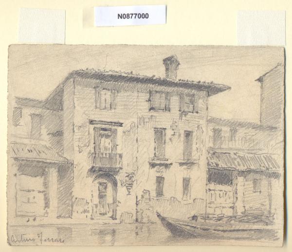 - NOTIZIE STORICO CRITICHE L'artista ha definito il disegno "A Santa Sofia" nella pagina manoscritta che accompagna il sesto dei diciotto fascicoli della raccolta denominata "Vecchia Milano". A proposito del foglio in esame si segnalano, per l'affinità del punto di ripresa, due analoghe vedute ad olio su cartone eseguite dallo stesso Ferrari, attualmente conservate l'una presso il Museo di Milano e l'altra presso la Galleria Giannoni a Novara; se nel disegno l'attenzione dell'artista è concentrata sulla definizione di un edificio, in entrambe le vedute ad olio, anch'esse ad orientamento orizzontale, si ottiene una visione più ampia che inquadra anche parte della via. \nLa via trae nome da una chiesa con annesso monastero, in origine detto di Santa Maria degli Angeli e attualmente denominato di Santa Maria della Visitazione, che, nel 1578, San Carlo destinò alle fanciulle rimaste orfane in seguito alla pestilenza del 1576, ponendolo sotto la protezione di Santa Sofia. Sofia fu una ricca vedova milanese, convertita al cristianesimo dal vescovo di Milano San Caio alla fine del I sec. d.C., che, recatasi a Roma con le tre figlie, venne martirizzata sulla via Aurelia. Le principali trasformazioni della zona risalgono al 1929 quando venne interrato il Naviglio, costruito nel Medioevo a protezione della città, che iniziava dal Ponte di Porta Romana e che correva lungo questa via. \nIn origine i Navigli costituivano la fossa interna che assurgeva al compito di arteria urbana per il traffico natante e cingeva la parte più cospicua della città. Attualmente il termine "Navigli", a Milano, identifica i due tratti scoperti del Naviglio Grande (fra le odierne Ripa di Porta Ticinese e l'Alzaia Naviglio Grande, in direzione di via Lodovico il Moro per Buccinasco e Corsico) e del Naviglio Pavese (fra via Ascanio Sforza e l'Alzaia Naviglio Pavese lungo via Chiesa Rossa per raggiungere Rozzano e collegarsi alla Strada dei Giovi) che si insinuano in città fino all'altezza di piazza XXIV Maggio e in senso più generale l'area compresa fra i due Navigli.\nLa vedova di Ferrari, proponendo i disegni all'attenzione del Comune di Milano, riconduceva la loro realizzazione agli ultimi anni di vita del marito. Una delle opere reca la data 1926; inoltre presso il Museo di Milano si conserva un'altra serie di 16 analoghe vedute a matita di Ferrari, datate dal 1924 al 1931. Pertanto si ritiene che la serie del Civico Gabinetto dei Disegni sia stata eseguita nell'arco cronologico dal 1924 al 1932. \nIn quell'epoca Milano stava conoscendo notevoli trasformazioni urbanistiche e il pittore, per contrastare la perdita di memoria provocata dalle demolizioni, decise di fissare nei suoi disegni gli angoli e gli scorci destinati a un radicale cambiamento.