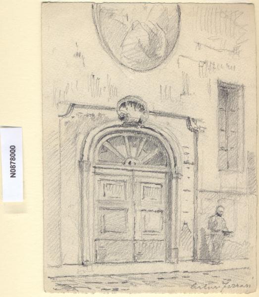 - NOTIZIE STORICO CRITICHE L'artista ha definito il disegno "Portale S. Pietro dei Pellegrini" nella pagina manoscritta che accompagna il sesto dei diciotto fascicoli della raccolta denominata "Vecchia Milano". L'odierna ubicazione della chiesa è corso di Porta Romana 118, in prossimità di via dei Pellegrini; sconsacrata alla fine dello scorso secolo, risulta attualmente fagocitata da moderne costruzioni e addirittura addossata ad un garage. \nLa chiesa di San Pietro dei Pellegrini venne fondata nel 1344 dal sacerdote Ambrogio Varese, come cappella dell'ospizio omonimo che all'epoca della costruzione si trovava fuori dalle mura di Milano e accoglieva per due giorni i pellegrini di passaggio in viaggio sulla via Emilia. I devoti visitatori di santuari, in transito per Milano verso Roma, erano alloggiati e mantenuti per due giorni nell'ospizio, se malati, passavano all'annessa infermeria. L'ospizio funzionò fino al 1770 quando fu soppresso da Maria Teresa e donato all'Orfanotrofio maschile di San Martino. Il Piermarini, incaricato del progetto del nuovo orfanotrofio, trovò il luogo non idoneo e preferì stabilire il cantiere presso il convento di san Pietro in Gessate, a sua volta ceduto agli orfani; la chiesetta di san Pietro si salvò così dalla demolizione. La semplice facciata a capanna presenta un grande portale originario di cotto sormontato da un rosone murato; l'interno è a un'unica navata a metà della quale si aprono due cappelle laterali. Agli inizi del XIX secolo, soppresso l'ospizio, la chiesa entrò a far parte della parrocchia di San Calimero.\nLa vedova di Ferrari, proponendo i disegni all'attenzione del Comune di Milano, riconduceva la loro realizzazione agli ultimi anni di vita del marito. Una delle opere reca la data 1926; inoltre presso il Museo di Milano si conserva un'altra serie di 16 analoghe vedute a matita di Ferrari, datate dal 1924 al 1931. Pertanto si ritiene che la serie del Civico Gabinetto dei Disegni sia stata eseguita nell'arco cronologico dal 1924 al 1932. \nIn quell'epoca Milano stava conoscendo notevoli trasformazioni urbanistiche e il pittore, per contrastare la perdita di memoria provocata dalle demolizioni, decise di fissare nei suoi disegni gli angoli e gli scorci destinati a un radicale cambiamento.