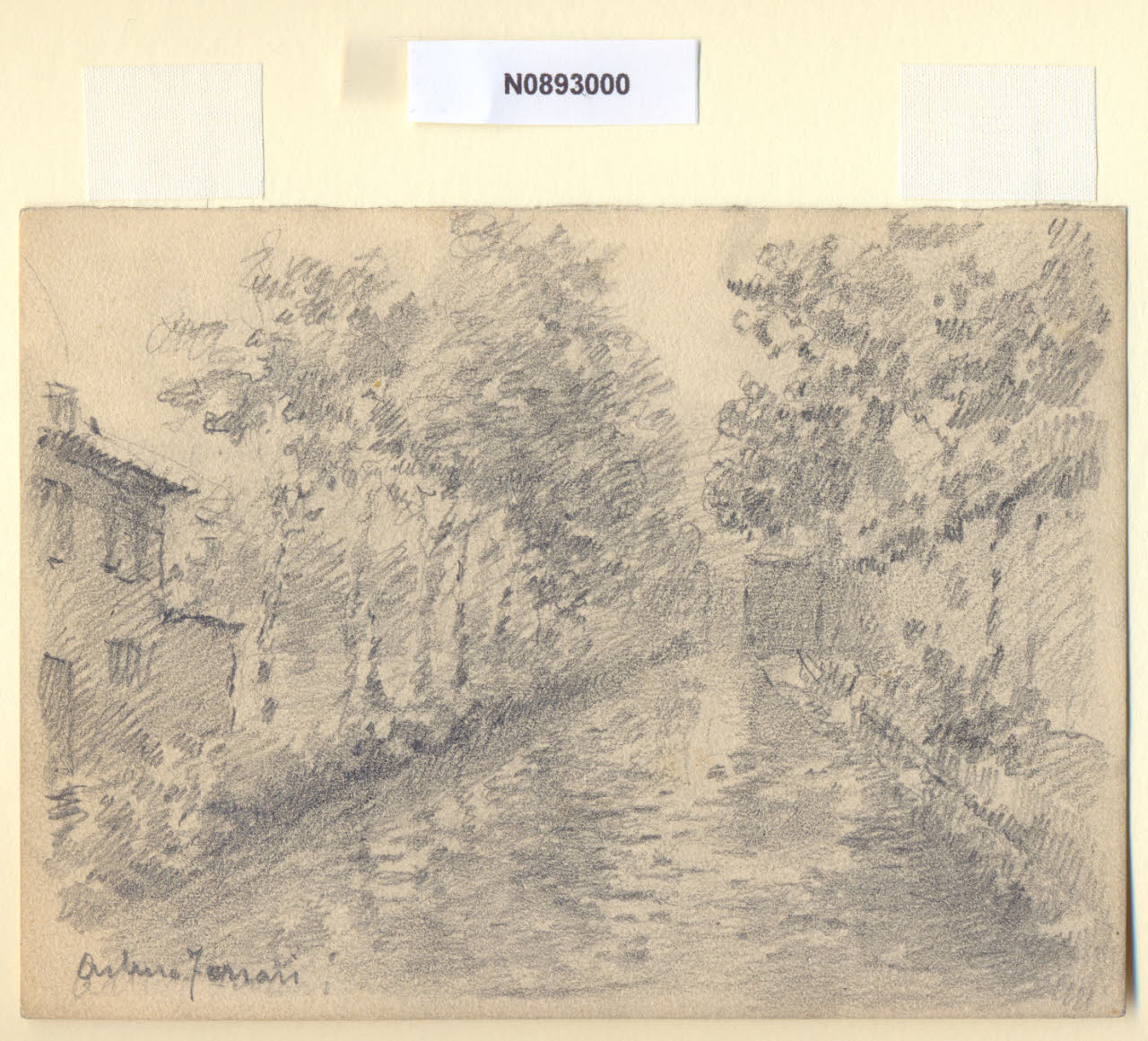 - NOTIZIE STORICO CRITICHE L'artista ha definito il disegno "Redefossi" nella pagina manoscritta che accompagna l'ottavo dei diciotto fascicoli della raccolta denominata "Vecchia Milano". Il Cavo Redefossi è un canale artificiale che attraversa Milano, si forma presso Porta Nuova, presso il Ponte delle Gabelle raccogliendo le acque del Seveso e del Naviglio della Martesana; attraversa Milano interamente sotto il manto stradale, sbuca all'aria aperta a San Donato Milanese, bagna San Giuliano Milanese e confluisce nel Cavo Vettabbia, tributario del Lambro, a nord di Melegnano. Il tratto del Redefossi che va da piazza Medaglie d'Oro al Lambro venne scavato tra il 1783 ed il 1786 per rimediare alle frequenti esondazioni che interessavano le zone di Porta Vittoria, Porta Romana e Porta Ludovica. Nel 1931, con la copertura dei Navigli, ricevette l'intera portata della Martesana, che poco prima, presso la Cascina dei Pomi, raccoglie la maggior parte delle acque del fiume Seveso. \nFuori dal centro cittadino i Navigli assunsero anche una fondamentale funzione economico-agricola, in quanto l'acqua costituiva indispensabile sussidio alla coltivazione delle fertilissime risaie e delle marcite.\nLa vedova di Ferrari, proponendo i disegni all'attenzione del Comune di Milano, riconduceva la loro realizzazione agli ultimi anni di vita del marito. Una delle opere reca la data 1926; inoltre presso il Museo di Milano si conserva un'altra serie di 16 analoghe vedute a matita di Ferrari, datate dal 1924 al 1931. Pertanto si ritiene che la serie del Civico Gabinetto dei Disegni sia stata eseguita nell'arco cronologico dal 1924 al 1932. \nIn quell'epoca Milano stava conoscendo notevoli trasformazioni urbanistiche e il pittore, per contrastare la perdita di memoria provocata dalle demolizioni, decise di fissare nei suoi disegni gli angoli e gli scorci destinati a un radicale cambiamento.