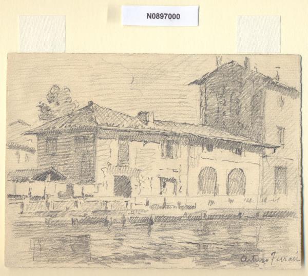 - NOTIZIE STORICO CRITICHE L'artista ha definito il disegno "Sulla Ripa" nella pagina manoscritta che accompagna l'ottavo dei diciotto fascicoli della raccolta denominata "Vecchia Milano". Dai riscontri in loco si ipotizza che l'attuale ubicazione degli edifici scorciati dal Ferrari corrisponda all'Alzaia del Naviglio Grande e che la tettoia a sinistra sia l'imbocco del vicolo Lavandai. \nOriginariamente le "Ripe" traevano nome dalle località verso cui si convogliavano le loro acque. In particolare la Ripa di Porta Ticinese, si dirigeva verso Pavia, l'antica "Ticinum"; costeggiava il Naviglio Grande, fungendo da passaggio per i cittadini, e si contrapponeva all'opposta riva detta "Alzaia", su cui transitavano i cavalli trainanti i barconi. Il Naviglio Grande, il più esteso canale milanese, era chiamato "Tesinello" poiché riceveva le acque del Ticino nei pressi di Tornavento, e, dopo un percorso di cinquanta chilometri, confluiva in città nella Darsena di Porta Ticinese. Fu scavato alle origini, negli anni tra il 1179 e il 1209, come canale d'irrigazione e in funzione di difesa della città dalle truppe del Barbarossa. Nel 1267 fu chiamato Grande quando la sua sezione fu allargata per renderlo navigabile, assumendo la funzione di importante via commerciale. Tutto il marmo usato per la costruzione del Duomo, dalle cave dell'Ossola, scendendo lungo il fiume Toce, il Lago Maggiore, il Ticino ed il Naviglio Grande, arrivava in città fino al Laghetto di Santo Stefano, vicinissimo al cantiere. La rete fluviale venne completata in seguito con lo scavo di altri canali navigabili, come l'attuale Naviglio Pavese, che collegava Milano con Pavia e che fu definitivamente inaugurato solo nel 1819. \nIn origine i Navigli costituivano la fossa interna che assurgeva al compito di arteria urbana per il traffico natante e cingeva la parte più cospicua della città. Attualmente il termine "Navigli", a Milano, identifica i due tratti scoperti del Naviglio Grande (fra le odierne Ripa di Porta Ticinese e l'Alzaia Naviglio Grande, in direzione di via Lodovico il Moro per Buccinasco e Corsico) e del Naviglio Pavese (fra via Ascanio Sforza e l'Alzaia Naviglio Pavese lungo via Chiesa Rossa per raggiungere Rozzano e collegarsi alla Strada dei Giovi) che si insinuano in città fino all'altezza di piazza XXIV Maggio e in senso più generale l'area compresa fra i due Navigli.\nLa vedova di Ferrari, proponendo i disegni all'attenzione del Comune di Milano, riconduceva la loro realizzazione agli ultimi anni di vita del marito. Una delle opere reca la data 1926; inoltre presso il Museo di Milano si conserva un'altra serie di 16 analoghe vedute a matita di Ferrari, datate dal 1924 al 1931. Pertanto si ritiene che la serie del Civico Gabinetto dei Disegni sia stata eseguita nell'arco cronologico dal 1924 al 1932. \nIn quell'epoca Milano stava conoscendo notevoli trasformazioni urbanistiche e il pittore, per contrastare la perdita di memoria provocata dalle demolizioni, decise di fissare nei suoi disegni gli angoli e gli scorci destinati a un radicale cambiamento.