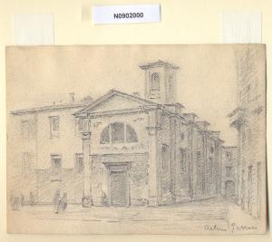 - NOTIZIE STORICO CRITICHE L'artista ha definito il disegno "S Michele al Dosso" nella pagina manoscritta che accompagna il nono dei diciotto fascicoli della raccolta denominata "Vecchia Milano". L'attuale denominazione del luogo è piazza Sant'Ambrogio. La chiesa ha origini molto antiche, si ipotizza che fosse stata fondata da Sant'Ambrogio e che vi fu incoronato re Teodorico (Torre C., Il ritratto di Milano..., Milano, F. Agnelli, 1674). Nel 1483 ne entrano in possesso le monache Agostiniane e a quel periodo risalirebbe il primo rifacimento dell'originaria chiesa. Un ulteriore rinnovamento edilizio si ha in seguito all'aggregazione del monastero nel 1576 alle norme emanate da San Carlo (le monache dovevano assistere alle funzioni da un ambiente a loro totalmente riservato e alla chiesa antica viene allora accostata una sala interna con un diverso orientamento, venendo a creare una struttura a T, ancor oggi visibile). Negli stessi anni si assiste anche al rifacimento della semplice facciata che termina con frontespizio triangolare e presenta una porta architravata di pietra, ed è dominata da una grande finestra a mezzaluna e da un campaniletto a loggia monofora. La chiesa soppressa nel 1785 da Giuseppe II, fu ripristinata nell'età della Restaurazione e assegnata alle suore orsoline di San Carlo nel 1842. \nLa vedova di Ferrari, proponendo i disegni all'attenzione del Comune di Milano, riconduceva la loro realizzazione agli ultimi anni di vita del marito. Una delle opere reca la data 1926; inoltre presso il Museo di Milano si conserva un'altra serie di 16 analoghe vedute a matita di Ferrari, datate dal 1924 al 1931. Pertanto si ritiene che la serie del Civico Gabinetto dei Disegni sia stata eseguita nell'arco cronologico dal 1924 al 1932. \nIn quell'epoca Milano stava conoscendo notevoli trasformazioni urbanistiche e il pittore, per contrastare la perdita di memoria provocata dalle demolizioni, decise di fissare nei suoi disegni gli angoli e gli scorci destinati a un radicale cambiamento.