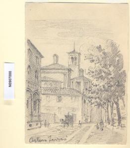 - NOTIZIE STORICO CRITICHE L'artista ha definito il disegno "Il Cassinotto" nella pagina manoscritta che accompagna il nono dei diciotto fascicoli della raccolta denominata "Vecchia Milano". L'attuale denominazione del luogo è largo Richini, il "cassinotto" era in origine una misera tettoia dalla struttura in legno addossata alla chiesa di San Nazaro Maggiore che fungeva da mercato dei latticini, ma che venne abbattutta durante le Cinque Giornate di Milano dopo che gli Austriaci vi avevano cercato scampo; la vecchia tettoia fu demolita in quell'occasione per impedire che potesse ancora servire da riparo al nemico. Già dopo il 1858 venne ricostruito nel medesimo luogo un nuovo edificio per il mercato dei latticini, anch'esso in seguito abbattuto.\nA proposito del foglio in esame si segnala, per l'affinità del punto di ripresa, un'analoga veduta a matita eseguita dallo stesso Ferrari, attualmente conservata presso il Museo di Milano e intitolata "S. Nazaro" (inv. 84).\nLa basilica di origine antichissima, fondata da Ambrogio nel 382, sorgeva ai margini di quella striscia di bosco e insieme giardino, detta brolo nel Medioevo; da qui il nome di San Nazaro in Brolo quando il vescovo Ambrogio vi collocò nel 396 il corpo rinvenuto di San Nazaro, martire con Celso sotto Nerone. Pur avendo subito ampie trasformazioni nel corso dei secoli, la basilica ha nel complesso mantenuto l'originario impianto paleocristiano; l'edificio conserva infatti l'antica pianta cruciforme a singola navata. A partire dal 1512 alla facciata di San Nazaro si aggiunse la Cappella Trivulzio, voluta da Gian Giacomo Trivulzio come mauseoleo per sè e per la sua famiglia; la cappella ha forma di alto parallelepipedo in cotto, a base quadrata, di semplici forme classiche, con pareti esterne spoglie contrassegnate soltanto da due ordini, mentre all'interno sviluppa una pianta ottagonale. Nel 1540 circa affianco alla basilica fu eretta la chiesa di Santa Caterina, che poi diverrà cappella della basilica e sarà posta in comunicazione ad essa mediante l'apertura di una porta. Il grande prestigio di cui godette San Nazaro è testimoniato dal fatto che vi furono tumulati numerosi vescovi di Milano. \nLa vedova di Ferrari, proponendo i disegni all'attenzione del Comune di Milano, riconduceva la loro realizzazione agli ultimi anni di vita del marito. Una delle opere reca la data 1926; inoltre presso il Museo di Milano si conserva un'altra serie di 16 analoghe vedute a matita di Ferrari, datate dal 1924 al 1931. Pertanto si ritiene che la serie del Civico Gabinetto dei Disegni sia stata eseguita nell'arco cronologico dal 1924 al 1932. \nIn quell'epoca Milano stava conoscendo notevoli trasformazioni urbanistiche e il pittore, per contrastare la perdita di memoria provocata dalle demolizioni, decise di fissare nei suoi disegni gli angoli e gli scorci destinati a un radicale cambiamento.