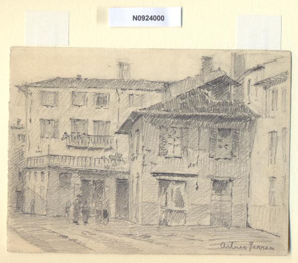 - NOTIZIE STORICO CRITICHE L'artista ha definito il disegno "In Via Gozzadini" nella pagina manoscritta che accompagna l'undicesimo dei diciotto fascicoli della raccolta denominata "Vecchia Milano". La via traeva nome da Beno de' Gozzadini, giureconsulto bolognese eletto podestà di Milano per l'anno 1257, al quale è ascritta la grande opera pubblica che vide il prolungamento del Ticinello (canale navigabile derivato dal Ticino) fino a Gaggiano, a beneficio dell'agricoltura e allo scopo di trasporto fluviale. Nel 1272 il Naviglio fu poi fatto giungere in città, pressappoco nel luogo dove sarebbe stata scavata la futura Darsena. Oggi esiste una nuova via Gozzadini in zona San Siro, mentre la vecchia via Gozzadini scomparve dalla toponomastica cittadina quando venne inglobata nell'ampliamento di via Santa Sofia. \nLa vedova di Ferrari, proponendo i disegni all'attenzione del Comune di Milano, riconduceva la loro realizzazione agli ultimi anni di vita del marito. Una delle opere reca la data 1926; inoltre presso il Museo di Milano si conserva un'altra serie di 16 analoghe vedute a matita di Ferrari, datate dal 1924 al 1931. Pertanto si ritiene che la serie del Civico Gabinetto dei Disegni sia stata eseguita nell'arco cronologico dal 1924 al 1932. \nIn quell'epoca Milano stava conoscendo notevoli trasformazioni urbanistiche e il pittore, per contrastare la perdita di memoria provocata dalle demolizioni, decise di fissare nei suoi disegni gli angoli e gli scorci destinati a un radicale cambiamento.