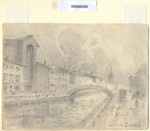 - NOTIZIE STORICO CRITICHE L'artista ha definito il disegno "P Ticinese" nella pagina manoscritta che accompagna il tredicesimo dei diciotto fascicoli della raccolta denominata "Vecchia Milano". Dai riscontri in loco si ipotizza che l'attuale ubicazione degli edifici scorciati dal Ferrari corrisponda all'Alzaia del Naviglio Grande e che l'incombente edificio visibile a destra corrisponda alla chiesa di Santa Maria delle Grazie al Naviglio.\nOriginariamente le "Ripe" traevano nome dalle località verso cui si convogliavano le loro acque. In particolare la Ripa di Porta Ticinese, si dirigeva verso Pavia, l'antica "Ticinum"; costeggiava il Naviglio grande, fungendo da passaggio per i cittadini, e si contrapponeva all'opposta riva detta "Alzaia", su cui transitavano i cavalli trainanti i barconi. Il Naviglio Grande, il più esteso canale milanese, era chiamato "Tesinello" poiché riceveva le acque del Ticino nei pressi di Tornavento, e, dopo un percorso di cinquanta chilometri, confluiva in città nella Darsena di Porta Ticinese. Fu scavato alle origini, negli anni tra il 1179 e il 1209, come canale d'irrigazione e in funzione di difesa della città dalle truppe del Barbarossa. Nel 1267 fu chiamato Grande quando la sua sezione fu allargata per renderlo navigabile, assumendo la funzione di importante via commerciale. Tutto il marmo usato per la costruzione del Duomo, dalle cave dell'Ossola, scendendo lungo il fiume Toce, il Lago Maggiore, il Ticino ed il Naviglio Grande, arrivava in città fino al Laghetto di Santo Stefano, vicinissimo al cantiere. La rete fluviale venne completata in seguito con lo scavo di altri canali navigabili, come l'attuale Naviglio Pavese che collega Milano con Pavia; il suo impiego è assai più tardo, in quanto fu definitivamente inaugurato solo nel 1819. \nIn origine i Navigli costituivano la fossa interna che assurgeva al compito di arteria urbana per il traffico natante e cingeva la parte più cospicua della città. Attualmente il termine "Navigli", a Milano, identifica i due tratti scoperti del Naviglio Grande (fra le odierne Ripa di Porta Ticinese e l'Alzaia Naviglio Grande, in direzione di via Lodovico il Moro per Buccinasco e Corsico) e del Naviglio Pavese (fra via Ascanio Sforza e l'Alzaia Naviglio Pavese lungo via Chiesa Rossa per raggiungere Rozzano e collegarsi alla Strada dei Giovi) che si insinuano in città fino all'altezza di piazza XXIV Maggio e in senso più generale l'area compresa fra i due Navigli.\nLa vedova di Ferrari, proponendo i disegni all'attenzione del Comune di Milano, riconduceva la loro realizzazione agli ultimi anni di vita del marito. Una delle opere reca la data 1926; inoltre presso il Museo di Milano si conserva un'altra serie di 16 analoghe vedute a matita di Ferrari, datate dal 1924 al 1931. Pertanto si ritiene che la serie del Civico Gabinetto dei Disegni sia stata eseguita nell'arco cronologico dal 1924 al 1932. \nIn quell'epoca Milano stava conoscendo notevoli trasformazioni urbanistiche e il pittore, per contrastare la perdita di memoria provocata dalle demolizioni, decise di fissare nei suoi disegni gli angoli e gli scorci destinati a un radicale cambiamento.