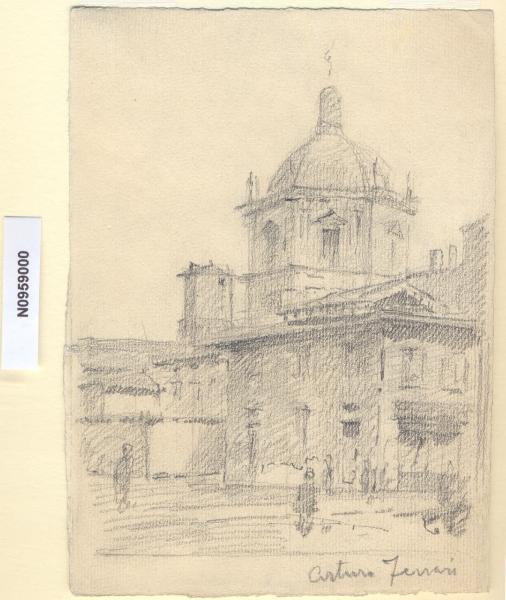 - NOTIZIE STORICO CRITICHE L'artista ha definito il disegno "La Vetra" nella pagina manoscritta che accompagna il quattordicesimo dei diciotto fascicoli della raccolta denominata "Vecchia Milano". L'attuale denominazione del luogo deriva da "Platea Vetus" o "Castrum Vetus" cioè "vecchio quartiere militare", situato un tempo nella piazza. Secondo una più accreditata ipotesi, la piazza trarrebbe nome da "Vepra", fossato che ne lambiva il margine e si scaricava nella fossa interna del Naviglio. La basilica che vi sorge, San Lorenzo Maggiore, è una delle principali testimonianze della Milano paleocristiana; di aspetto tardo cinquecentesco fu eretta fra la fine del IV secolo e l'inizio del V. Il disegno mostra il tiburio e la cupola, conclusa su progetto di Martino Bassi nel 1619. Dai dipinti del Migliara e di altri artisti Ottocenteschi appare il carattere della piazza Vetra col contrasto fra la mole di San Lorenzo e le casupole che si affacciavano al fossato che erano collegate alla piazza mediante passerelle. Le principali trasformazioni del luogo risalgono al 1929 quando venne previsto il risanamento del quartiere, isolando la parte posteriore della basilica, tra le cappelle di San Sisto e Sant'Aquilino, e destinando a verde l'area risultante dall'abbattimento degli edifici preesistenti.\nLa vedova di Ferrari, proponendo i disegni all'attenzione del Comune di Milano, riconduceva la loro realizzazione agli ultimi anni di vita del marito. Una delle opere reca la data 1926; inoltre presso il Museo di Milano si conserva un'altra serie di 16 analoghe vedute a matita di Ferrari, datate dal 1924 al 1931. Pertanto si ritiene che la serie del Civico Gabinetto dei Disegni sia stata eseguita nell'arco cronologico dal 1924 al 1932. \nIn quell'epoca Milano stava conoscendo notevoli trasformazioni urbanistiche e il pittore, per contrastare la perdita di memoria provocata dalle demolizioni, decise di fissare nei suoi disegni gli angoli e gli scorci destinati a un radicale cambiamento.