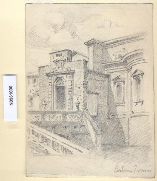 - NOTIZIE STORICO CRITICHE L'artista ha definito il disegno "Ponte Ospedale" nella pagina manoscritta che accompagna il quindicesimo dei diciotto fascicoli della raccolta denominata "Vecchia Milano". Ferrari si sofferma a descrivere il ponte che attraversava il Naviglio (oggi via Francesco Sforza) in corrispondenza con l'accesso posteriore dell'edificio originariamente sede dell'Ospedale Maggiore, con portale a bugnato fiancheggiato da vasi in pietra e con coronamento a volute. Il ponte fu costruito dopo il 1698 dall'ingegnere Attilio Arrigoni per agevolare il trasporto dei morti al nuovo camposanto (o Foppone, oggi Rotonda della Besana). Nella veduta si scorge anche la chiesa dell'ospedale, costruita nel Seicento e la cui abside fu compiuta su disegno di Gaetano Besia nel 1851-1854.\nIn origine i Navigli costituivano la fossa interna che assurgeva al compito di arteria urbana per il traffico natante e cingeva la parte più cospicua della città. La zona appare oggi del tutto diversa e le principali trasformazioni risalgono alla seconda metà del XIX secolo, quando, in seguito all'introduzione dei tram, si iniziò a ipotizzare la copertura dei tratti cittadini dei Navigli. Nel 1891 il primo segmento della fossa interna ad essere sacrificato fu quello occidentale, il cosiddetto Naviglio di San Gerolamo; a partire dal 1929 i lavori di copertura ripresero con sistematicità ininterrotta fino al 1930/1931. Attualmente il termine "Navigli", a Milano, identifica i due tratti scoperti del Naviglio Grande (fra le odierne Ripa di Porta Ticinese e l'Alzaia Naviglio Grande, in direzione di via Lodovico il Moro per Buccinasco e Corsico) e del Naviglio Pavese (fra via Ascanio Sforza e l'Alzaia Naviglio Pavese lungo via Chiesa Rossa per raggiungere Rozzano e collegarsi alla Strada dei Giovi) che si insinuano in città fino all'altezza di piazza XXIV Maggio e in senso più generale l'area compresa fra i due Navigli.\nLa vedova di Ferrari, proponendo i disegni all'attenzione del Comune di Milano, riconduceva la loro realizzazione agli ultimi anni di vita del marito. Una delle opere reca la data 1926; inoltre presso il Museo di Milano si conserva un'altra serie di 16 analoghe vedute a matita di Ferrari, datate dal 1924 al 1931. Pertanto si ritiene che la serie del Civico Gabinetto dei Disegni sia stata eseguita nell'arco cronologico dal 1924 al 1932. \nIn quell'epoca Milano stava conoscendo notevoli trasformazioni urbanistiche e il pittore, per contrastare la perdita di memoria provocata dalle demolizioni, decise di fissare nei suoi disegni gli angoli e gli scorci destinati a un radicale cambiamento.