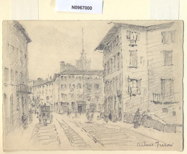 - NOTIZIE STORICO CRITICHE L'artista ha definito il disegno "Ponte e Verziere" nella pagina manoscritta che accompagna il quindicesimo dei diciotto fascicoli della raccolta denominata "Vecchia Milano". Nel XVI secolo la zona detta del Verziere, oltre ad essere la sede del mercato ortofrutticolo (Verziere deriva da verzura, verdura), trasferito nel 1783 dal ministro Carlo Di Firmian nella vicina piazza Santo Stefano, era uno dei luoghi più malfamati di Milano. Negli anni Trenta del Novecento la zona fu oggetto di "risanamento" edilizio e abbattuto l'antico tessuto urbano, ritenuto malsano e indecoroso, sorsero i magniloquenti palazzi del nuovo centro. La vicinanza al Duomo, le cui guglie emergono sopra i tetti raffigurati nel disegno in esame, rendeva l'area particolarmente appetibile alle mire del mercato immobiliare.\nLa vedova di Ferrari, proponendo i disegni all'attenzione del Comune di Milano, riconduceva la loro realizzazione agli ultimi anni di vita del marito. Una delle opere reca la data 1926; inoltre presso il Museo di Milano si conserva un'altra serie di 16 analoghe vedute a matita di Ferrari, datate dal 1924 al 1931. Pertanto si ritiene che la serie del Civico Gabinetto dei Disegni sia stata eseguita nell'arco cronologico dal 1924 al 1932. \nIn quell'epoca Milano stava conoscendo notevoli trasformazioni urbanistiche e il pittore, per contrastare la perdita di memoria provocata dalle demolizioni, decise di fissare nei suoi disegni gli angoli e gli scorci destinati a un radicale cambiamento.