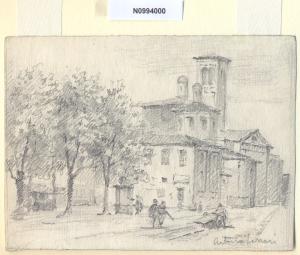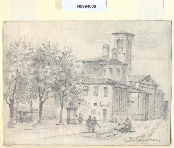 - NOTIZIE STORICO CRITICHE L'artista ha definito il disegno "Cassinotto" nella pagina manoscritta che accompagna l'ultimo dei diciotto fascicoli della raccolta denominata "Vecchia Milano". L'attuale denominazione del luogo è largo Richini. Il "cassinotto" era in origine una misera tettoia dalla struttura in legno addossata alla chiesa di San Nazaro Maggiore che fungeva da mercato dei latticini, ma che venne abbattutta durante le Cinque Giornate di Milano dopo che gli Austriaci vi avevano cercato scampo; la vecchia tettoia fu demolita in quell'occasione per impedire che potesse ancora servire da riparo al nemico. Già dopo il 1858 venne ricostruito nel medesimo luogo un nuovo edificio per il mercato dei latticini, anch'esso in seguito abbattuto.\nA proposito del foglio in esame si segnala, per l'affinità del punto di ripresa, un'analoga veduta a matita eseguita dallo stesso Ferrari, attualmente conservata presso il Museo di Milano e intitolata "S. Nazaro" (inv. 84).\nLa basilica di origine antichissima, fondata da Ambrogio nel 382, sorgeva ai margini di quella striscia di bosco e insieme giardino, detta brolo nel Medioevo; da qui il nome di S. Nazaro in Brolo quando il vescovo Ambrogio vi collocò nel 396 il corpo rinvenuto di San Nazaro, martire con Celso sotto Nerone. Pur avendo subito ampie trasformazioni nel corso dei secoli, la basilica, ha nel complesso mantenuto l'originario impianto paleocristiano. Nel 1540 circa affianco alla basilica fu eretta la chiesa di Santa Caterina, che poi diverrà cappella della basilica e sarà posta in comunicazione ad essa mediante l'apertura di una porta. Il grande prestigio di cui godette San Nazaro è testimoniato dal fatto che vi furono tumulati numerosi vescovi di Milano. \nLa vedova di Ferrari, proponendo i disegni all'attenzione del Comune di Milano, riconduceva la loro realizzazione agli ultimi anni di vita del marito. Una delle opere reca la data 1926; inoltre presso il Museo di Milano si conserva un'altra serie di 16 analoghe vedute a matita di Ferrari, datate dal 1924 al 1931. Pertanto si ritiene che la serie del Civico Gabinetto dei Disegni sia stata eseguita nell'arco cronologico dal 1924 al 1932. \nIn quell'epoca Milano stava conoscendo notevoli trasformazioni urbanistiche e il pittore, per contrastare la perdita di memoria provocata dalle demolizioni, decise di fissare nei suoi disegni gli angoli e gli scorci destinati a un radicale cambiamento.