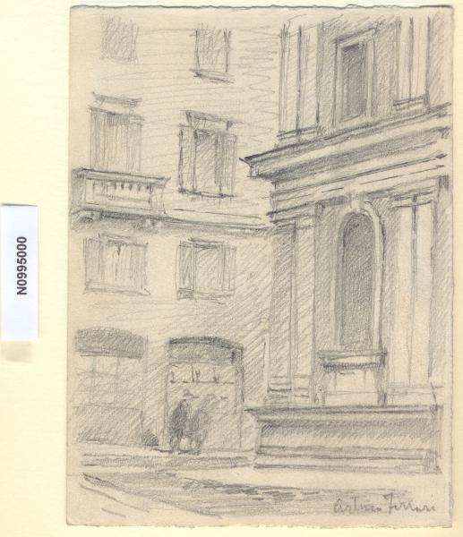 - NOTIZIE STORICO CRITICHE L'artista ha definito il disegno "All'ospedale" nella pagina manoscritta che accompagna l'ultimo dei diciotto fascicoli della raccolta denominata "Vecchia Milano". La contrada era anticamente dominata su un lato dal frontone dell'edificio dell'Ospedale e sull'altro lato da una zona nosocomio. L'Ospedale venne originariamente edificato nel 1456, sotto Francesco Sforza, su disegno del Filarete, al quale si aggiunsero in seguito Guinforte Solari, progettista delle bifore in cotto sopra il porticato ad archi, e Giovanni Antonio Amadeo, ai tempi di Ludovico il Moro. Interrotti nel corso del Cinquecento, i lavori furono ripresi nella prima metà del Seicento con gli architetti Francesco Maria Richini, Giovanni Battista Pessina, Fabio Mangone e il pittore Giovan Battista Crespi detto il Cerano. Tra il 1798 e il 1804 fu edificato il terzo tratto della facciata liscio e sobrio nella sua compostezza neoclassica, secondo le direttive dell'ingegnere Pietro Castelli; la continuità della linea dei cornicioni e la tinteggiatura rosso-mattone dell'intonaco fecero sì che essa continuasse, senza contrasti e con una certa armonia, l'andamento della facciata preesistente, della quale Ferrari raffigura l'angolo verso la contrada del Laghetto.\nNel 1939 l'ospedale, ormai non più rispondente alle necessità dell'assistenza, venne ceduto al Comune di Milano che lo destinò a sede dell'Università degli Studi.\nLa vedova di Ferrari, proponendo i disegni all'attenzione del Comune di Milano, riconduceva la loro realizzazione agli ultimi anni di vita del marito. Una delle opere reca la data 1926; inoltre presso il Museo di Milano si conserva un'altra serie di 16 analoghe vedute a matita di Ferrari, datate dal 1924 al 1931. Pertanto si ritiene che la serie del Civico Gabinetto dei Disegni sia stata eseguita nell'arco cronologico dal 1924 al 1932. \nIn quell'epoca Milano stava conoscendo notevoli trasformazioni urbanistiche e il pittore, per contrastare la perdita di memoria provocata dalle demolizioni, decise di fissare nei suoi disegni gli angoli e gli scorci destinati a un radicale cambiamento.