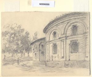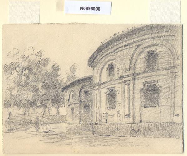 - NOTIZIE STORICO CRITICHE L'artista ha definito il disegno "Alla Rotonda" nella pagina manoscritta che accompagna l'ultimo dei diciotto fascicoli della raccolta denominata "Vecchia Milano". L'attuale denominazione del luogo è Rotonda della Besana, in origine fu definito "Foppone dell'Ospedale" poichè venne eretto nel 1698, su disegno dell'architetto Attilio Arrigoni, con l'idea di adibirlo a cimitero dell'Ospedale Maggiore. Nello stesso anno circa venne costruito il ponte sul Naviglio dell'Ospedale per agevolare le comunicazioni con il nuovo camposanto. Prima le spoglie venivano inumate in sepolcri aperti lungo il Naviglio, poi, per le proteste degli abitanti della zona, si decise di edificare nuovi sepolcri in un luogo più appartato e si iniziarono i lavori per il porticato a pianta curvilinea. Già nel 1706 il nuovo cimitero risultò insufficiente per il notovele ampliamento del nosocomio e inadatto per la presenza di numerose sorgenti nel terreno. Quindi tra il 1713 e il 1725, all'interno dell'ampio porticato plurilobato, fu ampliata la chiesa di S. Michele ai Nuovi Sepolcri, su progetto dell'ingegnere Carlo Francesco Raffagno, con pianta a croce greca e cupola ottagona al centro. Nel 1792, a seguito del decreto che proibiva l'inumazione nella cinta cittadina, il cimitero venne chiuso e la rotonda adibita a magazzino e lavanderia, finché nel 1809 il viceré d'Italia Eugenio di Beauharnais incaricò il Cagnola di trasformarla in Pantheon, destinato ad accogliere le sepolture degli uomini più illustri della città, progetto che non fu però mai attuato. Ceduto poi al Comune di Milano, il complesso fu restaurato nel 1956 e attualmente è adibito a sede di manifestazioni culturali.\nLa vedova di Ferrari, proponendo i disegni all'attenzione del Comune di Milano, riconduceva la loro realizzazione agli ultimi anni di vita del marito. Una delle opere reca la data 1926; inoltre presso il Museo di Milano si conserva un'altra serie di 16 analoghe vedute a matita di Ferrari, datate dal 1924 al 1931. Pertanto si ritiene che la serie del Civico Gabinetto dei Disegni sia stata eseguita nell'arco cronologico dal 1924 al 1932. \nIn quell'epoca Milano stava conoscendo notevoli trasformazioni urbanistiche e il pittore, per contrastare la perdita di memoria provocata dalle demolizioni, decise di fissare nei suoi disegni gli angoli e gli scorci destinati a un radicale cambiamento.