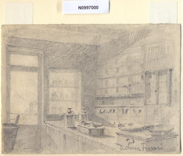 - NOTIZIE STORICO CRITICHE L'artista ha definito il disegno "Il Bellasio" nella pagina manoscritta che accompagna l'ultimo dei diciotto fascicoli della raccolta denominata "Vecchia Milano". L'antica Drogheria Bellasio, sull'angolo fra via Verziere e il Naviglio, era la più vecchia bottega di Milano, aperta nel 1624 e resistita a varie vicissitudini, fino alla copertura del Naviglio nel 1930. \nA proposito del foglio in esame si segnala, per l'affinità di soggetto, un acquerello eseguito dallo stesso Ferrari, attualmente conservato presso il Museo di Milano; rispetto all'acquerello, che inquadra l'esterno della storica drogheria, il disegno si concentra sulla definizione dell'interno della bottega.\nLa vedova di Ferrari, proponendo i disegni all'attenzione del Comune di Milano, riconduceva la loro realizzazione agli ultimi anni di vita del marito. Una delle opere reca la data 1926; inoltre presso il Museo di Milano si conserva un'altra serie di 16 analoghe vedute a matita di Ferrari, datate dal 1924 al 1931. Pertanto si ritiene che la serie del Civico Gabinetto dei Disegni sia stata eseguita nell'arco cronologico dal 1924 al 1932.