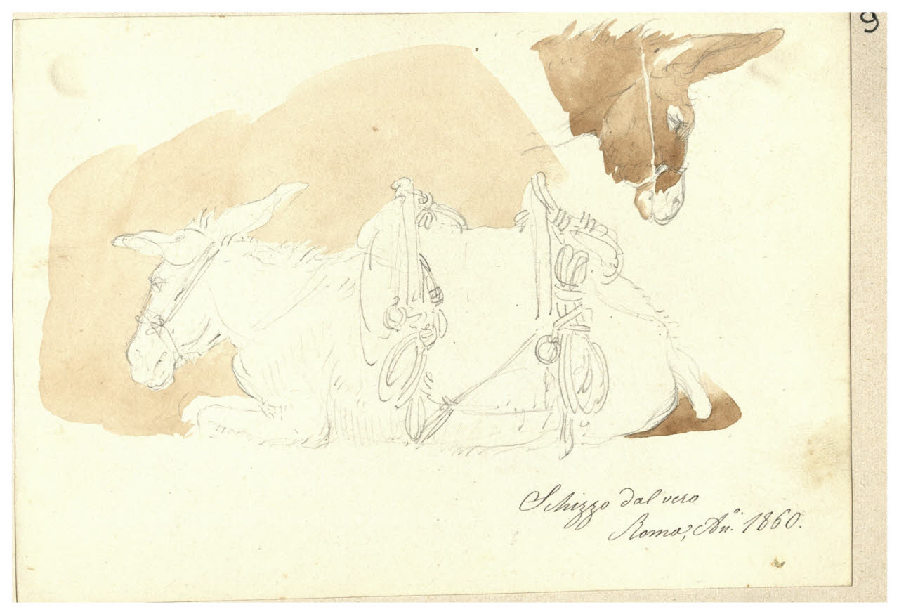 Asino a riposo e muso di asino (Schizzo dal vero Roma 1860)