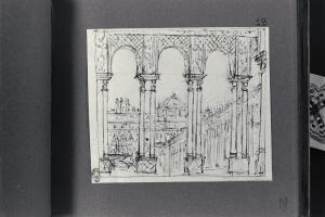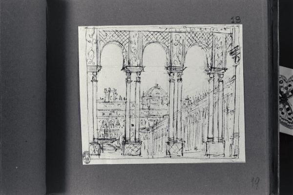 - NOTIZIE STORICO CRITICHE Il disegno fa parte di un piccolo album Vallardi del 1840, di dimensioni mm 160 x 175, sulla cui copertina in pelle marrone chiaro è incisa l'iscrizione in lettere capitali dorate "Paolo Landriani / milanese / e suoi contemporanei / nell'arte prospettica valentissimi / questi loro disegni / Giuseppe Vallardi / raccolse per tramandare / co' passati maestri a' futuri / la stabile rinomanza / della scuola lombarda / l'anno MDCCCXL". Ogni singolo disegno è incollato a un foglio dell'album di carta di colore grigio-azzurro.