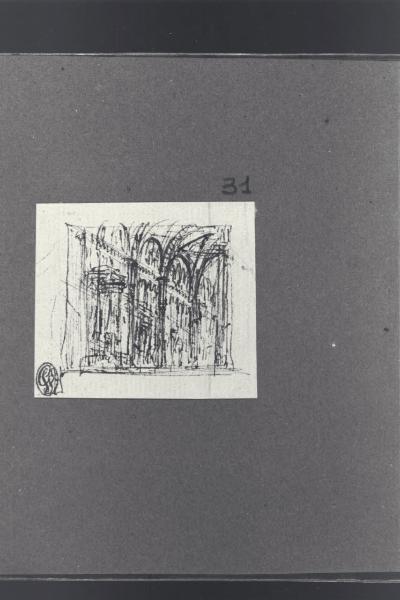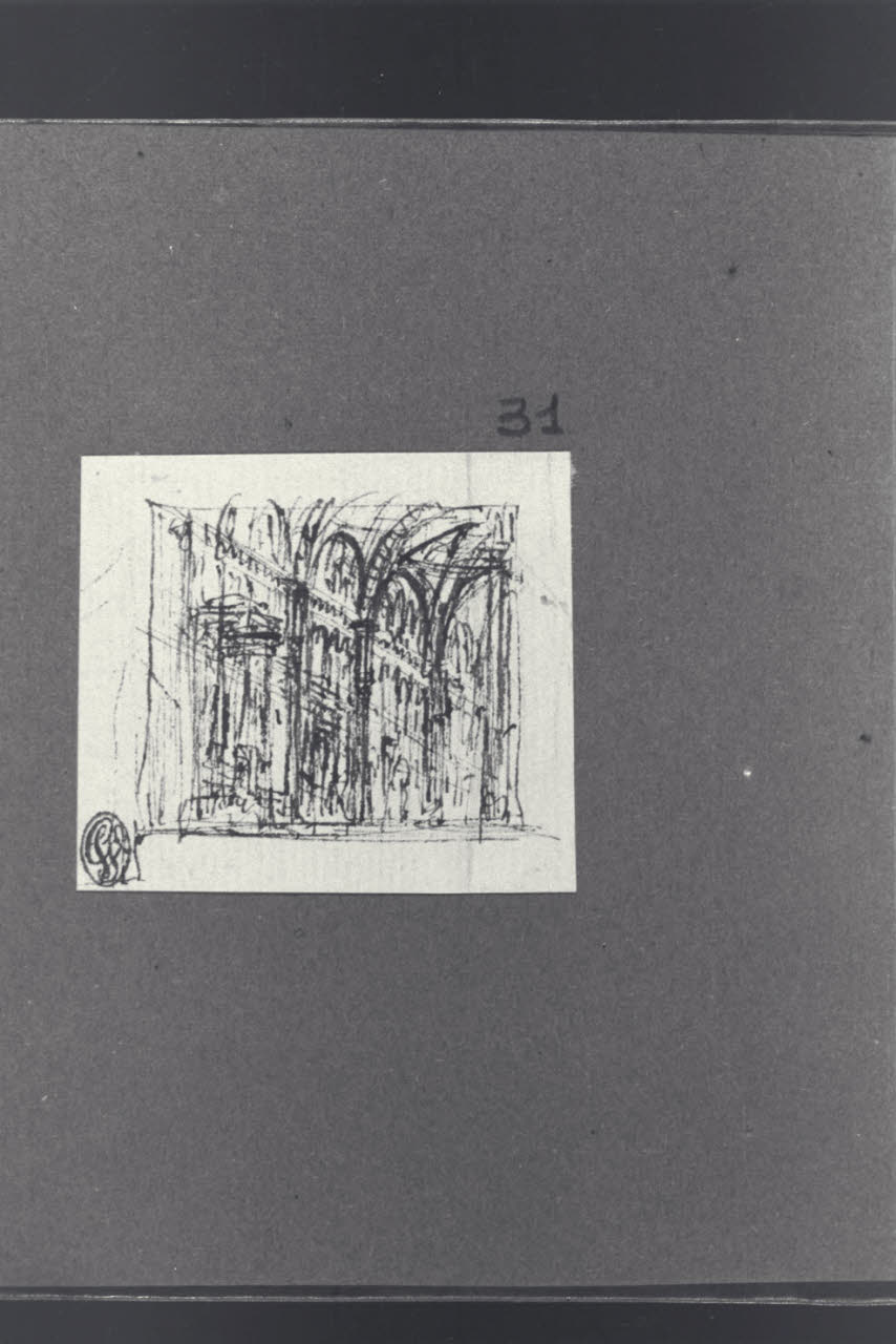 - NOTIZIE STORICO CRITICHE Il disegno fa parte di un piccolo album Vallardi del 1840, di dimensioni mm 160 x 175, sulla cui copertina in pelle marrone chiaro è incisa l'iscrizione in lettere capitali dorate "Paolo Landriani / milanese / e suoi contemporanei / nell'arte prospettica valentissimi / questi loro disegni / Giuseppe Vallardi / raccolse per tramandare / co' passati maestri a' futuri / la stabile rinomanza / della scuola lombarda / l'anno MDCCCXL". Ogni singolo disegno è incollato a un foglio dell'album di carta di colore grigio-azzurro.