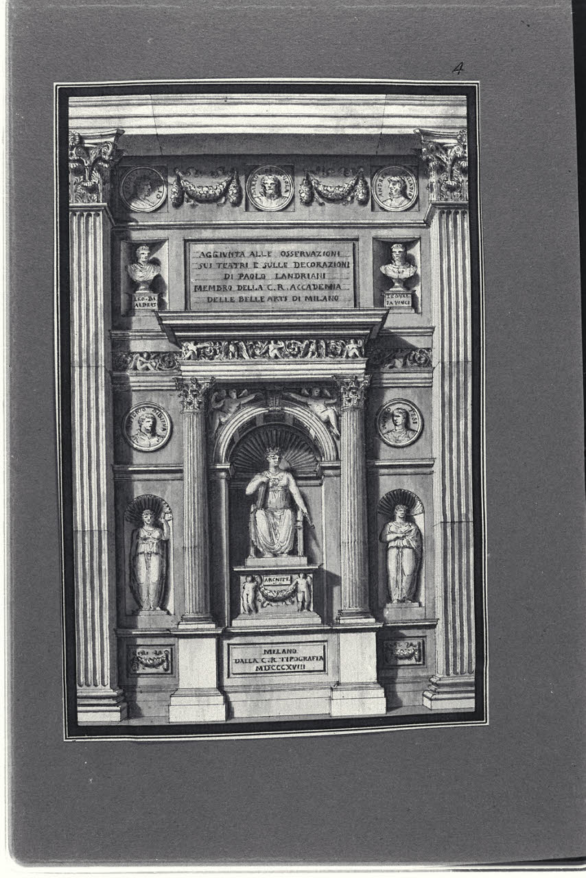 - NOTIZIE STORICO CRITICHE Il disegno fa parte di un album Vallardi del 1840, di dimensioni mm 352 x 460, sulla cui copertina in pelle marrone chiaro è incisa l'iscrizione in lettere capitali dorate "Paolo Landriani / milanese / e suoi contemporanei / nell'arte prospettica valentissimi / questi loro disegni / Giuseppe Vallardi / raccolse / per tramandare / co' passati maestri a' futuri / la stabile rinomanza / della scuola lombarda / l'anno MDCCCXL". Ogni singolo disegno è incollato a un foglio dell'album di carta di colore grigio-azzurro.\nCome desumibile anche da una delle iscrizioni, si tratta dello studio per il frontespizio dello scritto di Landriani "Aggiunta alla Osservazioni sui teatri e sulle decorazioni", pubblicato a Milano nel 1818 per Pietro e Giuseppe Vallardi. Nell'edizione a stampa, l'incisione venne realizzata da Ferdinando Albertolli. Nel disegno sono presenti i ritratti clipeati di artisti e architetti celebri come Sebastiano Serlio, Jacopo Barozzi da Vignola, Andrea Palladio, Antonio Galli da Bibbiena e Mauro Tesi; compaiono anche Leon Battista Alberti e Leonardo da Vinci, raffigrati a mezzo busto.